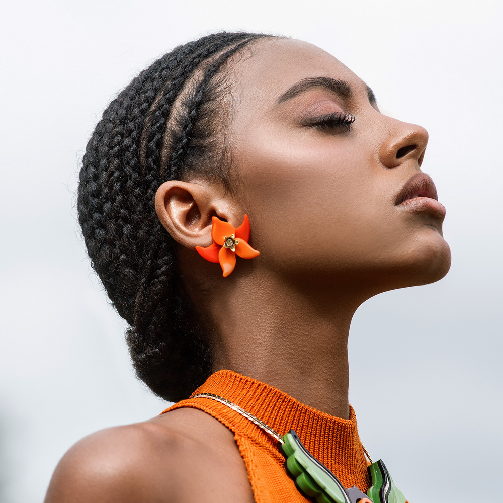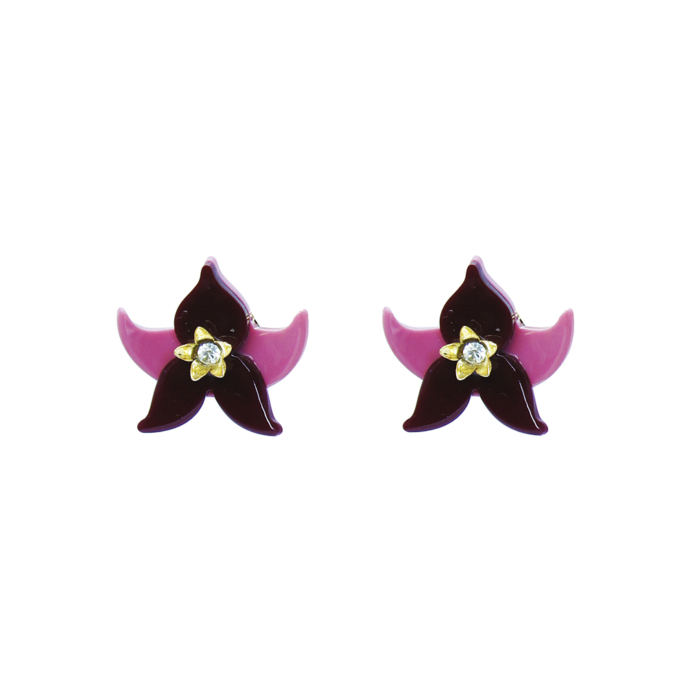 Brinco de acrílico artesanal, com strass e metais com acabamento dourado.