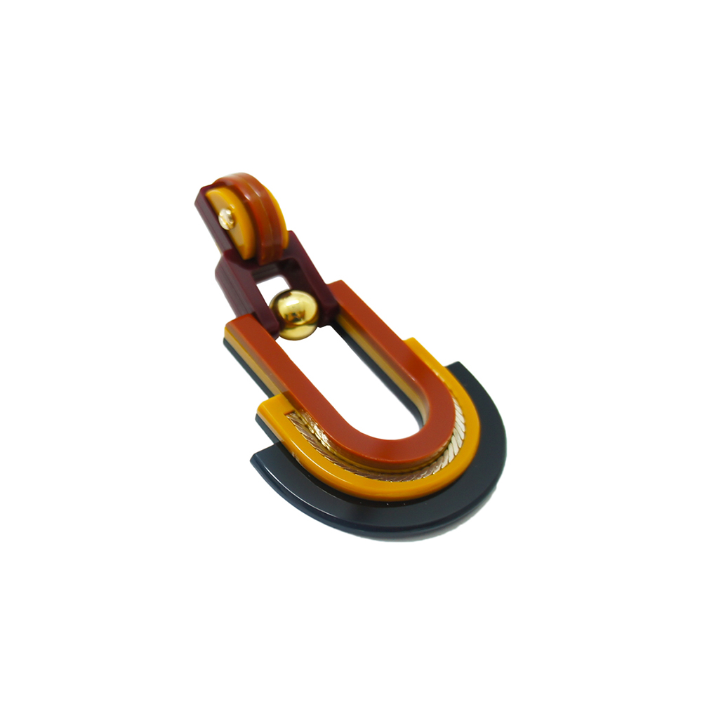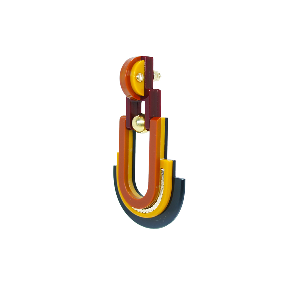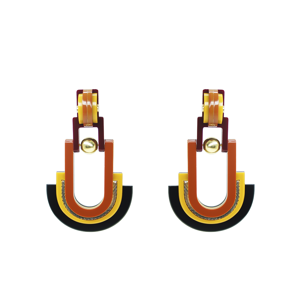 Brinco de acrílico feito à mão, articulado, com conta em ABS, corrente e metais com acabamento dourado.