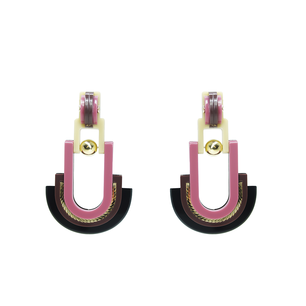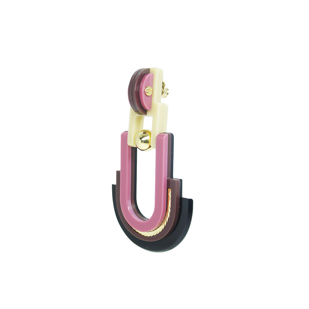 Brinco de acrílico feito à mão, articulado, com conta em ABS, corrente e metais com acabamento dourado.