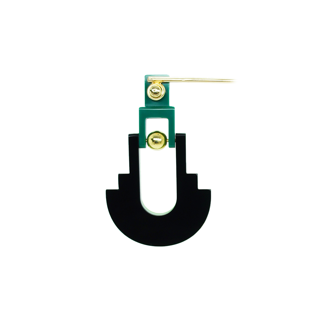 Brinco de acrílico feito à mão, articulado, com conta em ABS, corrente e metais com acabamento dourado.