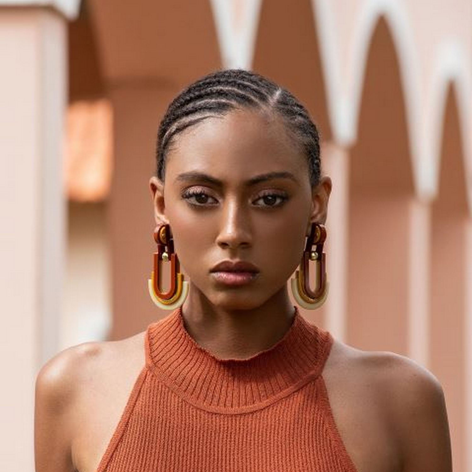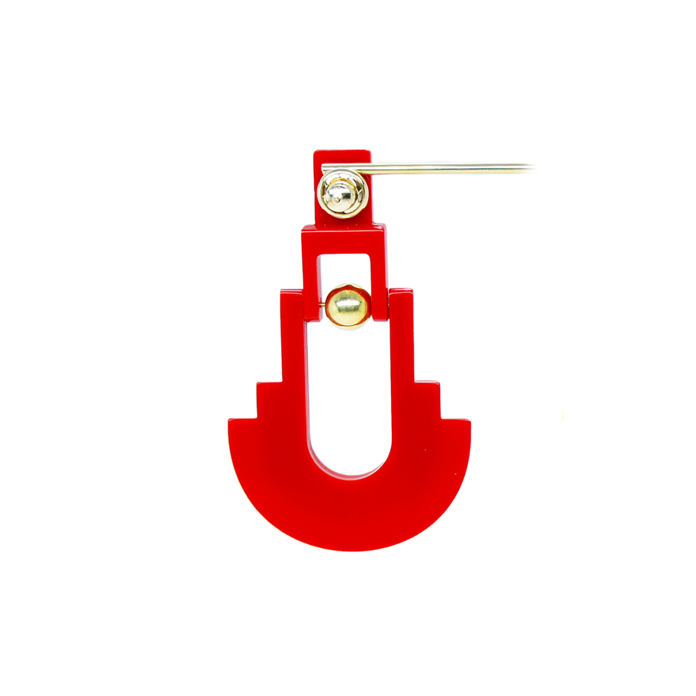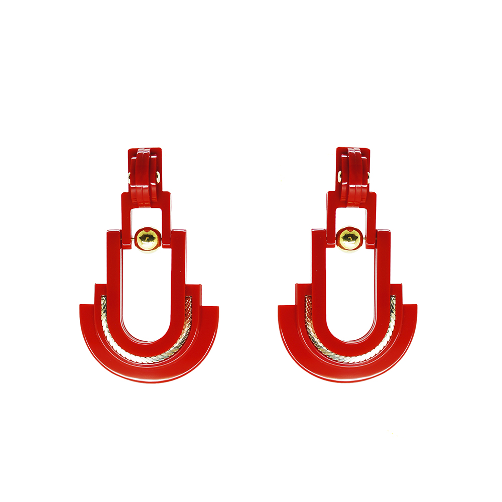 Brinco de acrílico feito à mão, articulado, com conta em ABS, corrente e metais com acabamento dourado.