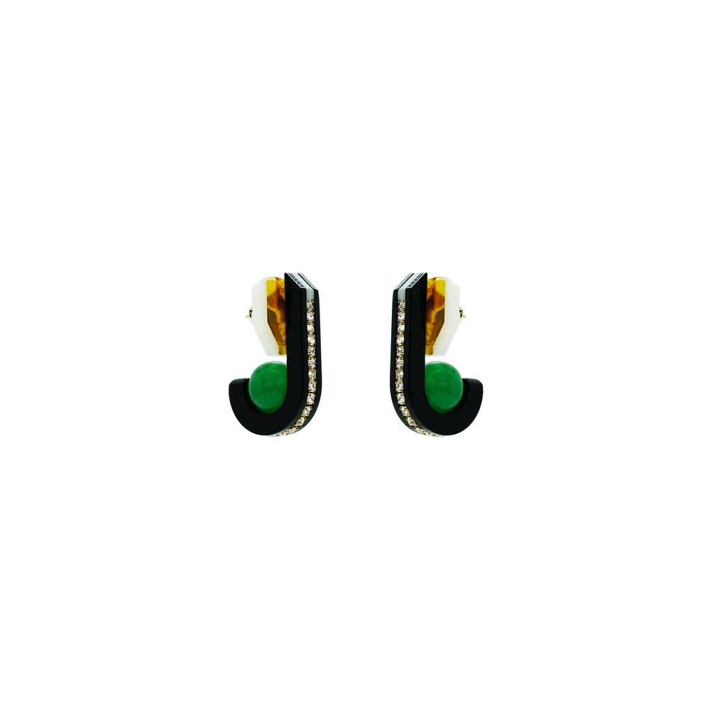 Brinco de acrílico com aplicação de strass de vidro e conta de Quartzo Rosa, Jade Verde tingida ou Sodalita. Metais com acabamento dourado. Feito à mão por artesãos brasileiros.