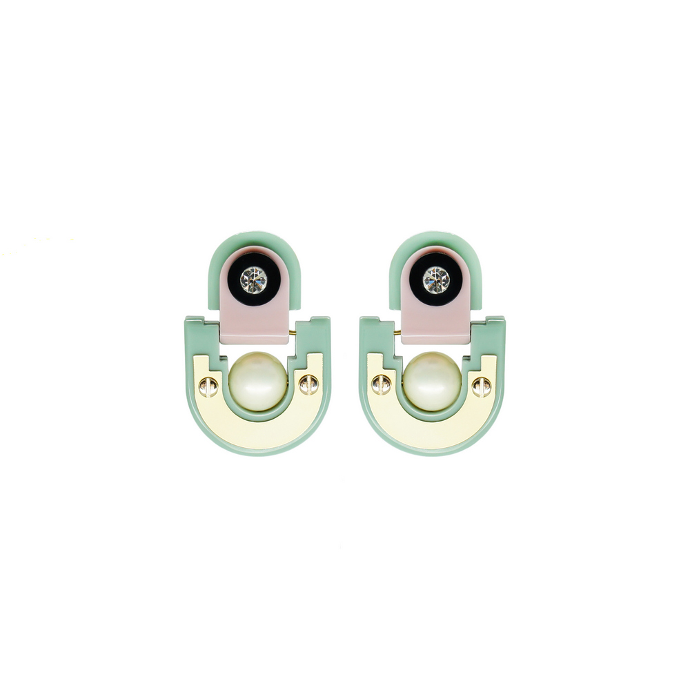 Brinco curto de acrílico, com aplicação de enfeite de metal dourado, pérola sheel e strass de vidro. Metais com acabamento dourado. Feito a mão, por artesãos brasileiros.