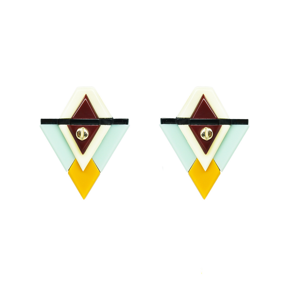 Brinco curto de acrílico, com metais com acabamento dourado. Feito a mão por artesãos brasileiros.