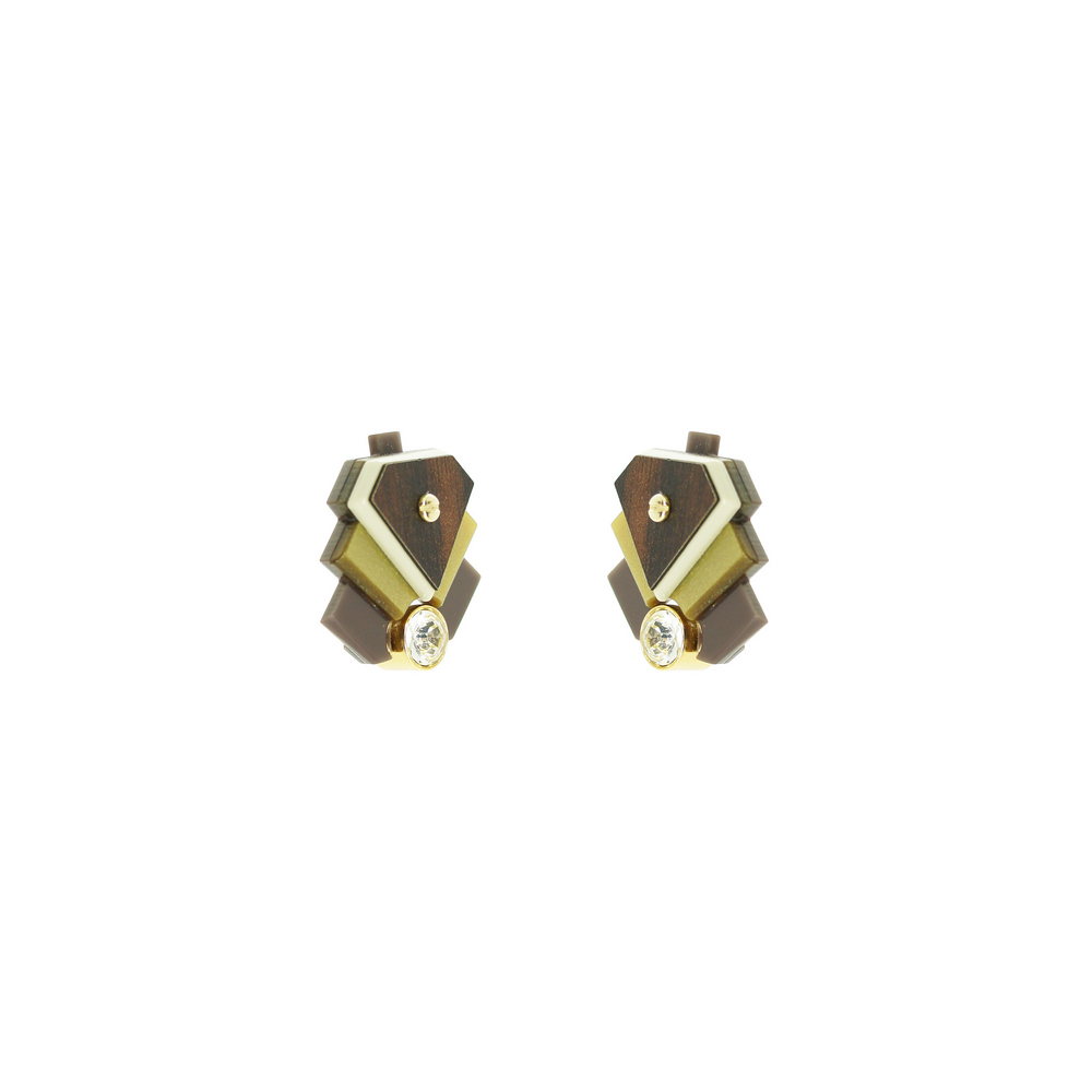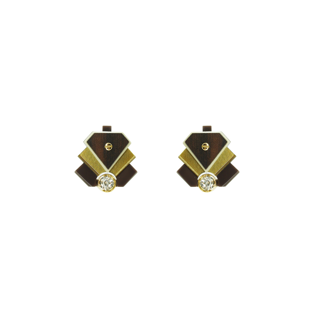Brinco feito de acrílico, com aplicação de fórmica, com strass de vidro, metal em Zamak, com metais em acabamento dourado, brinco com pino em aço inox. Feito a mão por artesãos brasileiros.