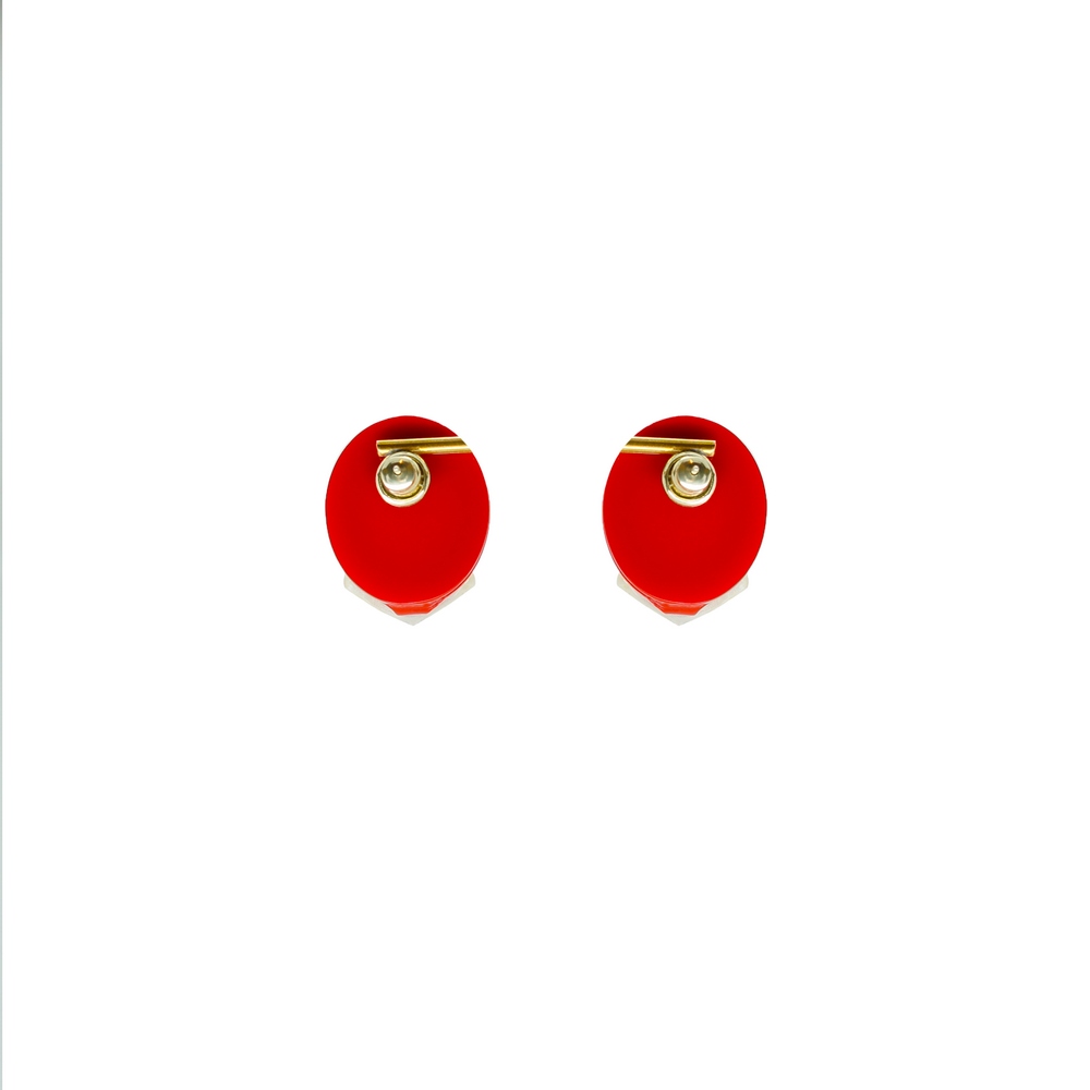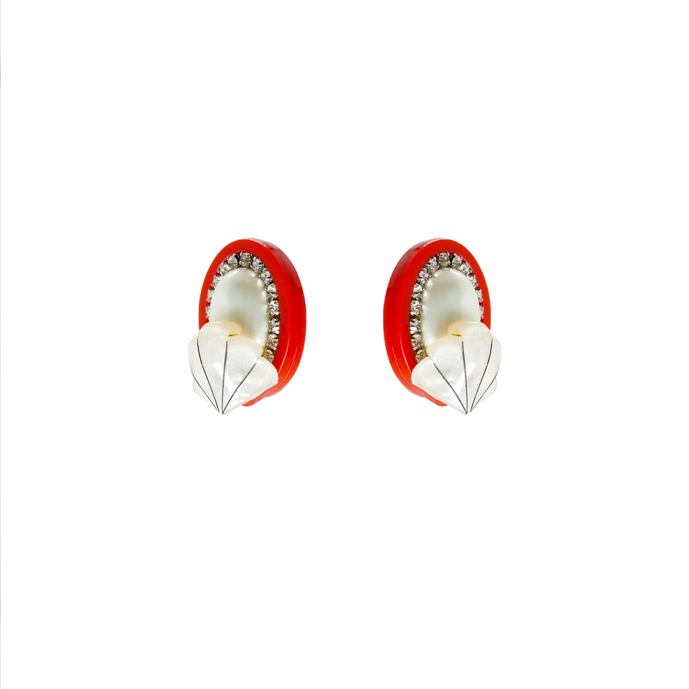 Brinco de acrílico, modelo curto, com aplicação de strass de vidro e pérola shell, metais com acabamento dourado. Feito à mão por artesãos brasileiros.