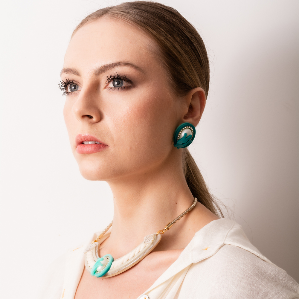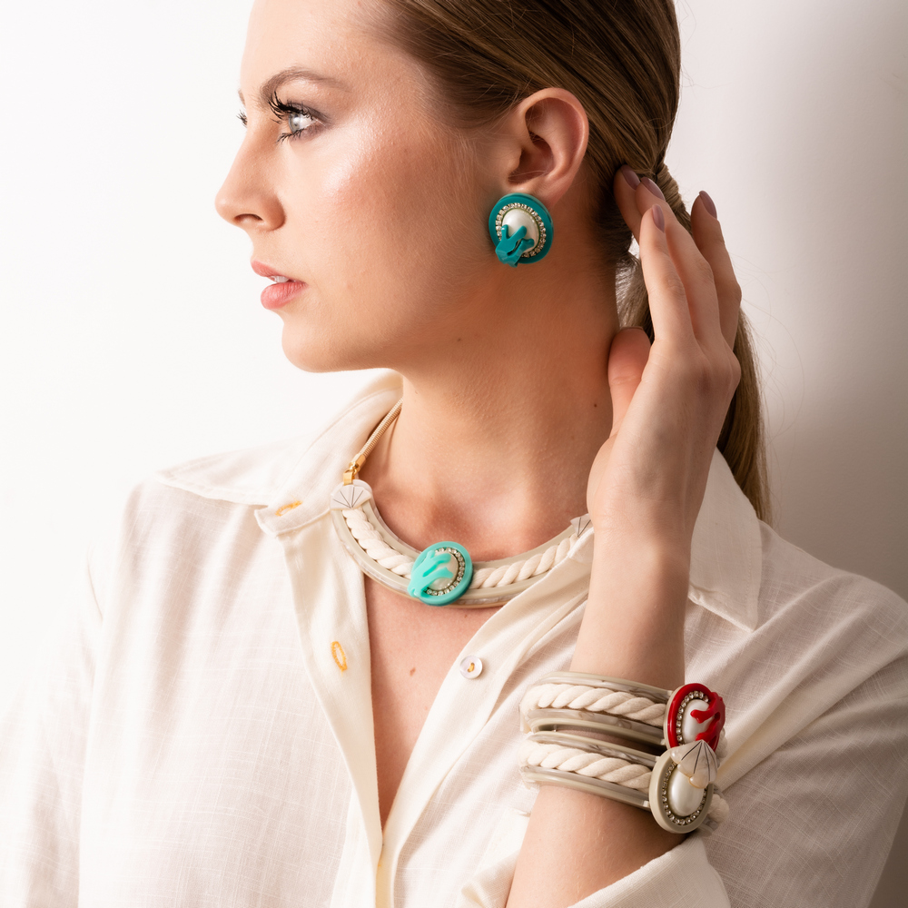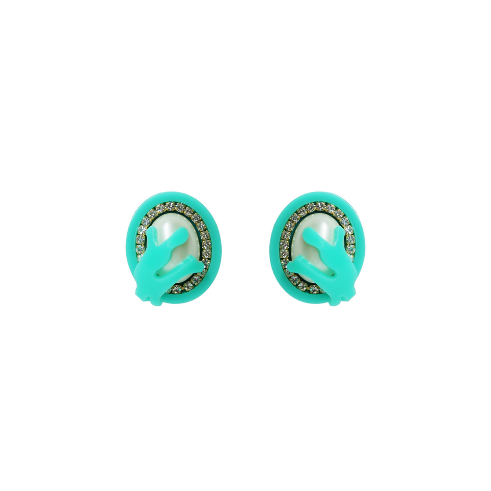 Brinco feito de acrílico, com aplicação de strass de vidro e pérola cabochão, metais com acabamento dourado. Feito a mão por artesãos brasileiros.