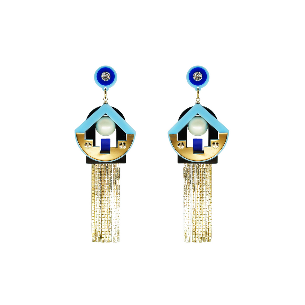 Brinco de acrílico com franjas de corrente de metal, enfeite de latão com acabamento ouro, pérola sheel, strass de vidro. Metais com acabamento dourado. Feito a mão por artesãos brasileiros.