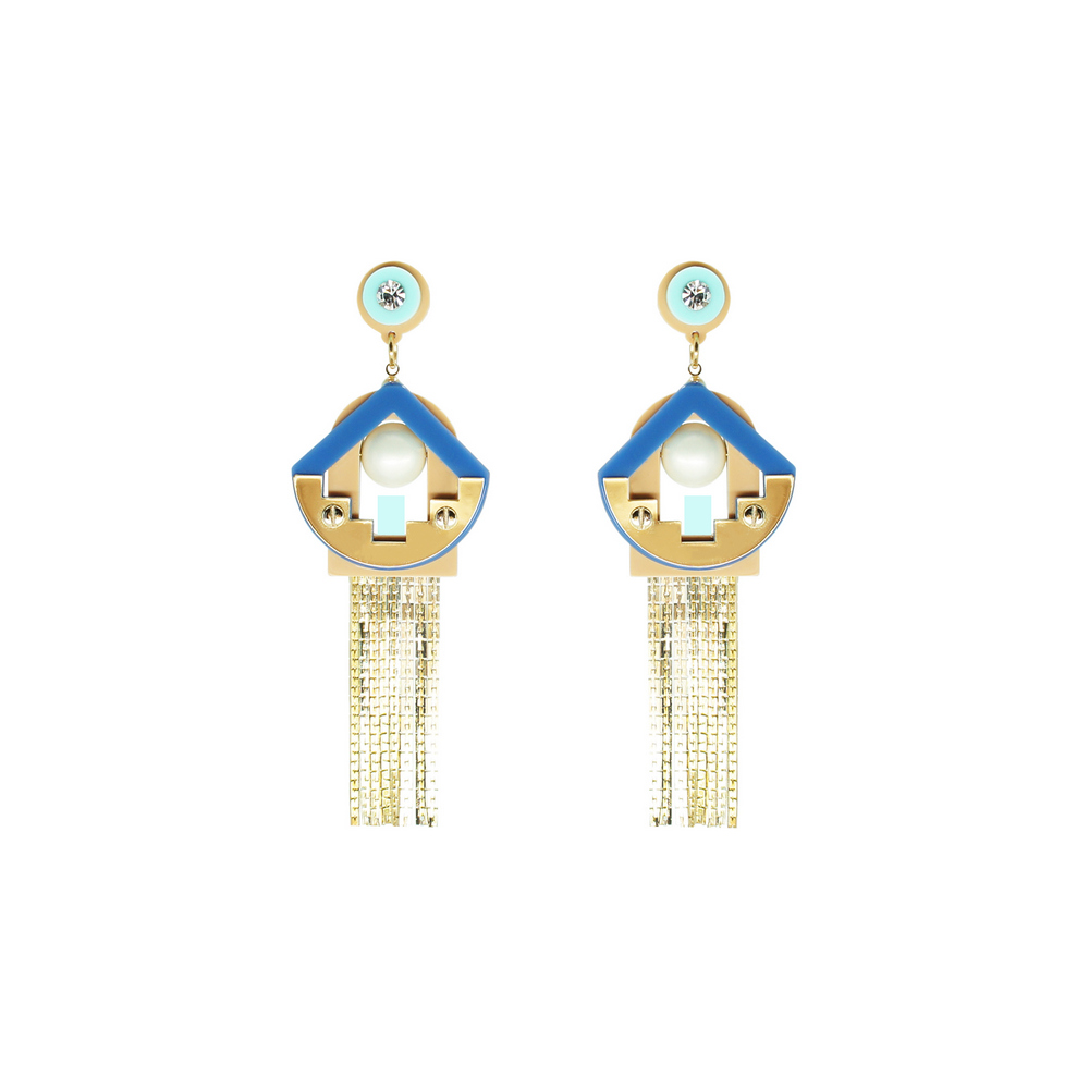 Brinco de acrílico com franjas de corrente de metal, enfeite de latão com acabamento ouro, pérola sheel, strass de vidro. Metais com acabamento dourado. Feito a mão por artesãos brasileiros.