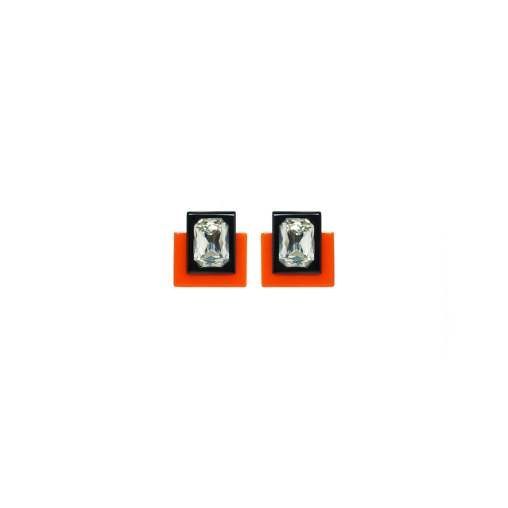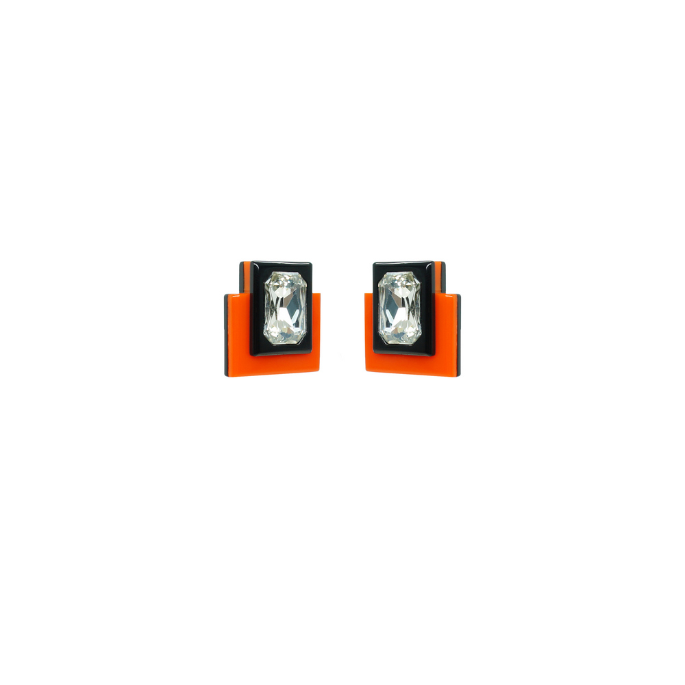 Brinco de acrílico, com aplicação de pedra de vidro e metais com acabamento dourado. Feito à mão por artesãos brasileiros.