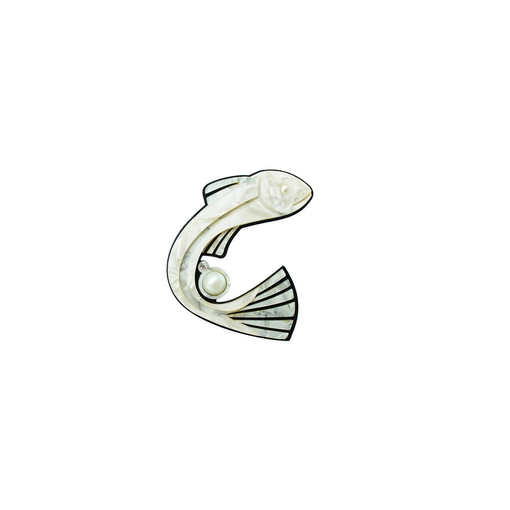 Broche feito de acrílico, com fixação por alfinete, com aplicação de pérola, metais com acabamento dourado. Feito a mão por artesãos brasileiros.
