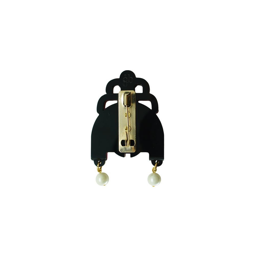 Broche de acrílico, com alfinete de fixação, aplicação de pérola shell, strass de vidro, aplicação de detalhe em metal dourado, metais com acabamento dourado. Feito a mão por artesãos brasileiros.