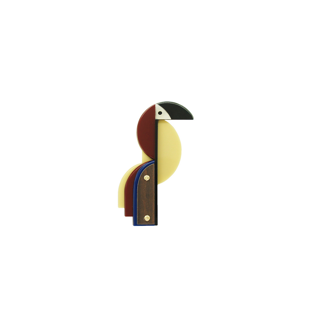Broche Tucano, feito de acrílico, com aplicação de fórmica jacarandá, metais com acabamento dourado. Feito à mão por artesãos brasileiros.