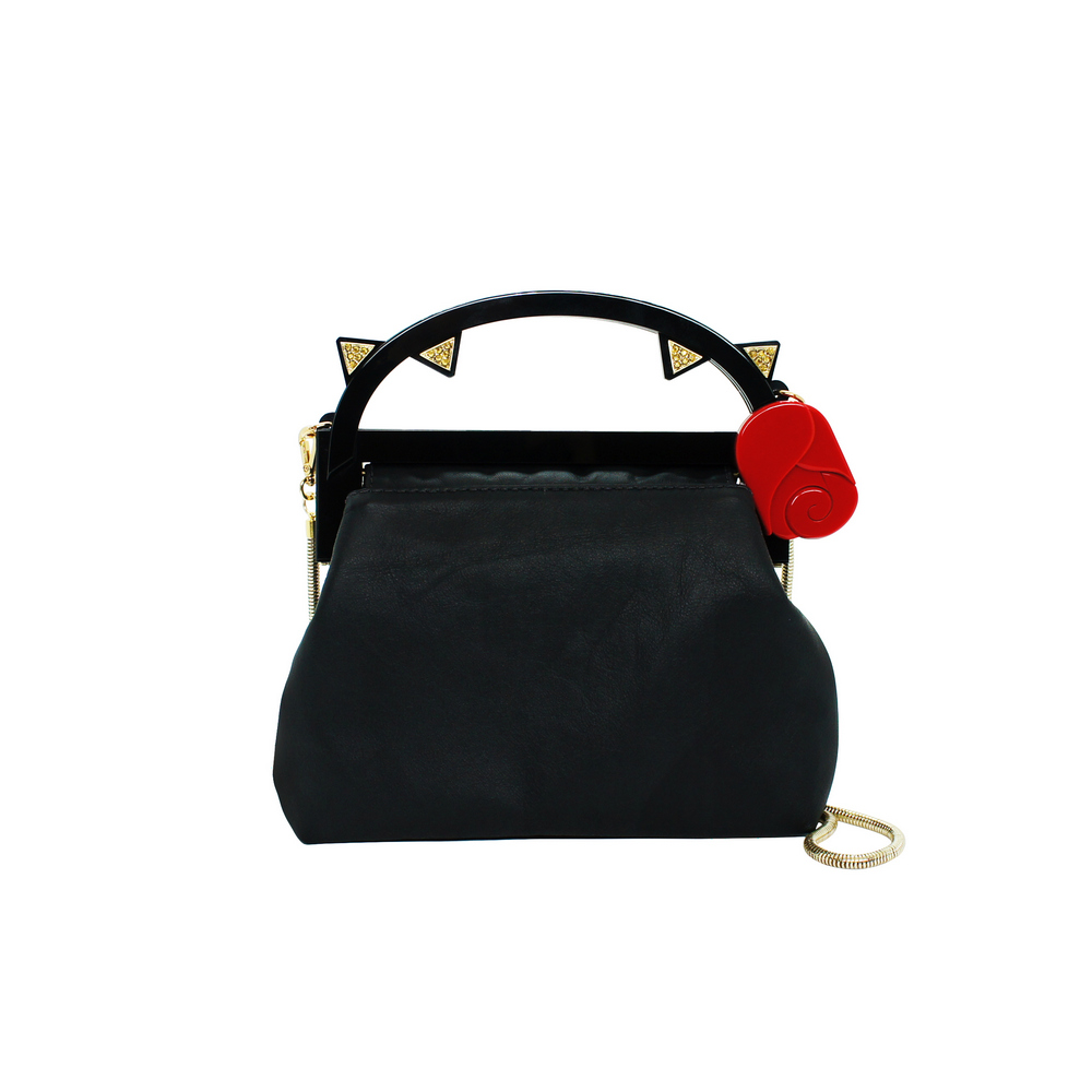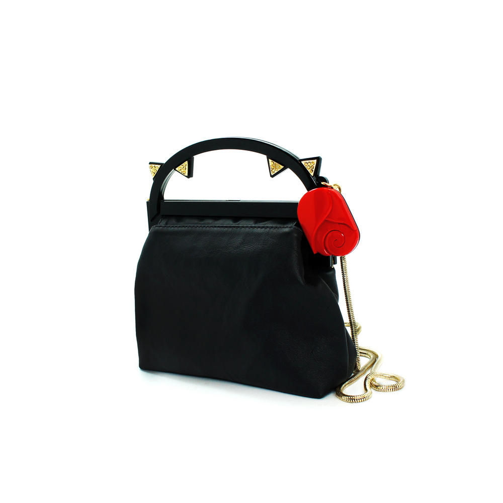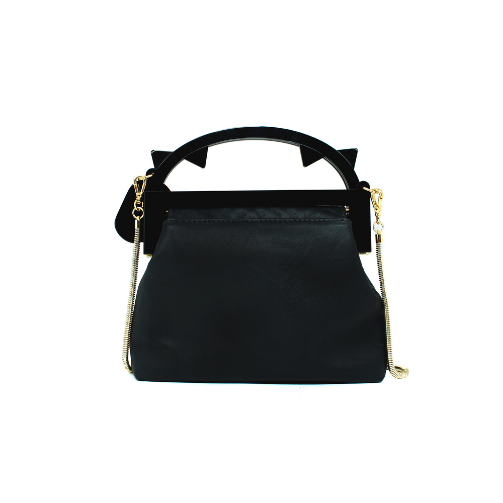 Bolsa com detalhes e alça curta de acrílico, com base em couro e aplicação de enfeites de metal. Vem com uma alça longa removível em uma corrente de metal. Metais com acabamento dourado. Feito à mão por artesãos brasileiros.