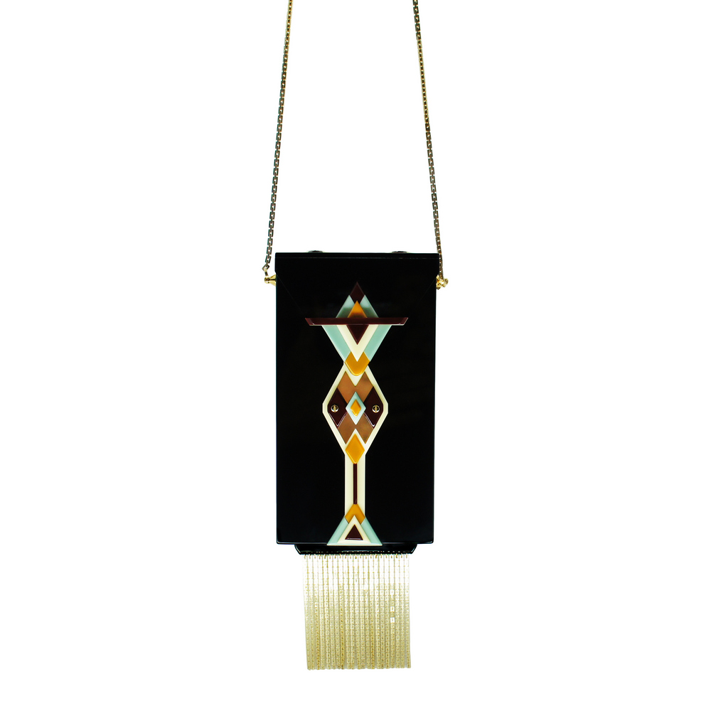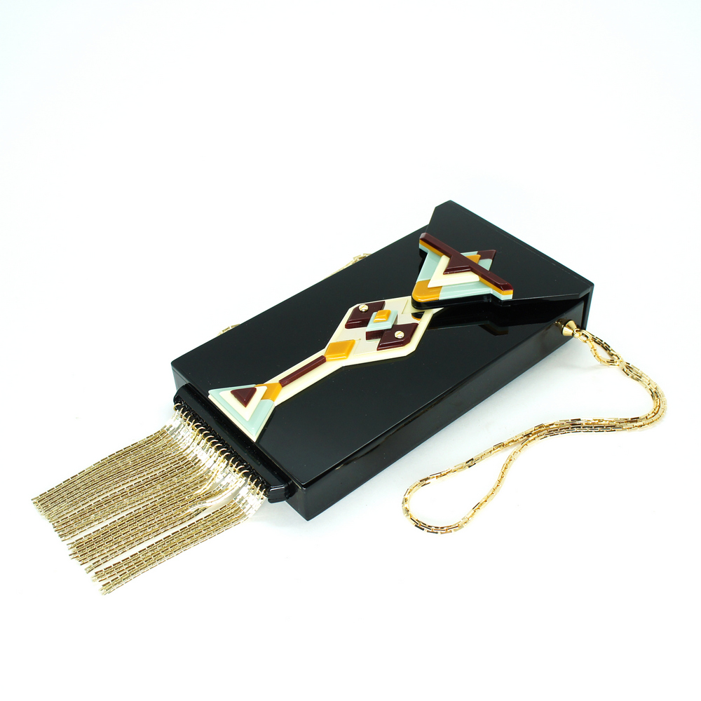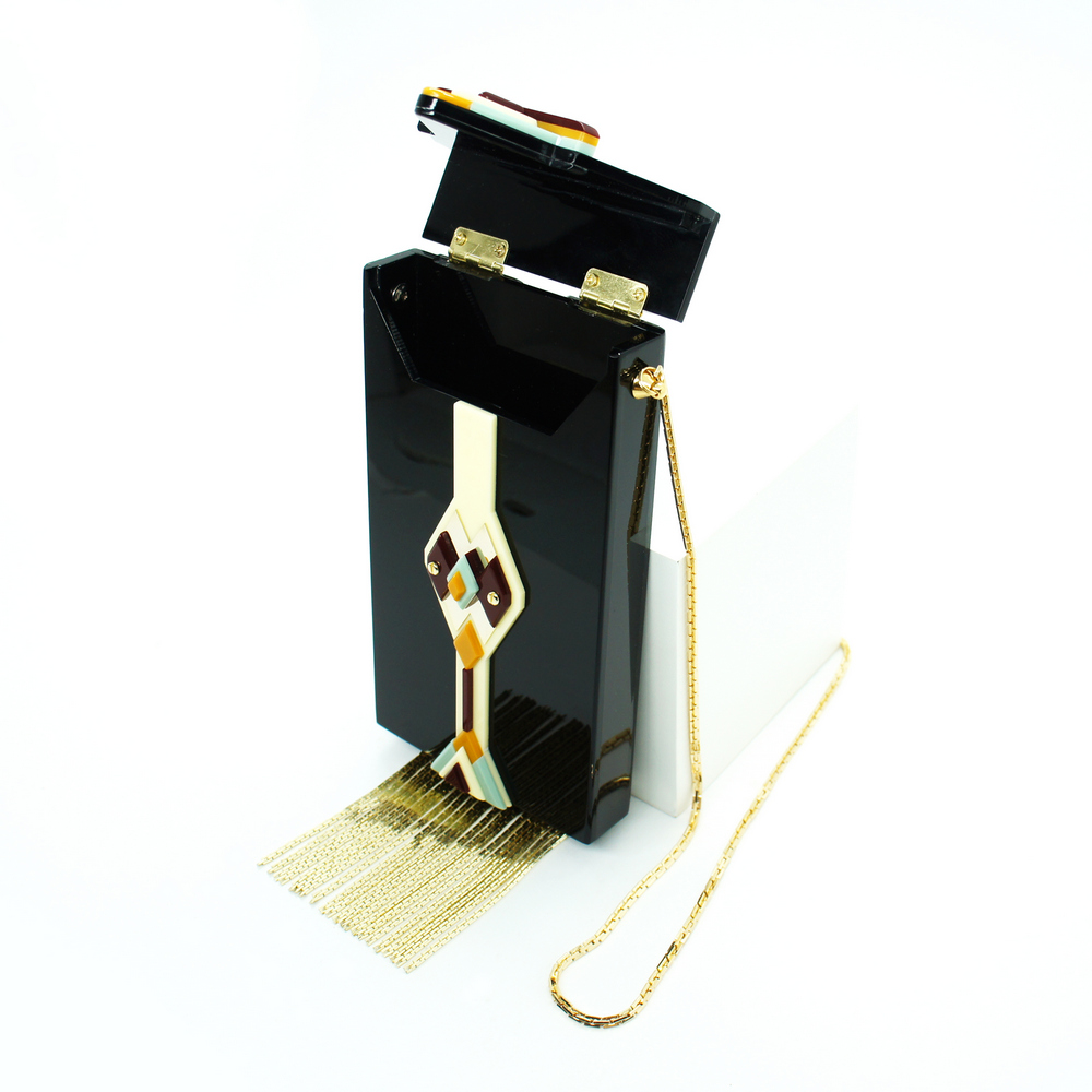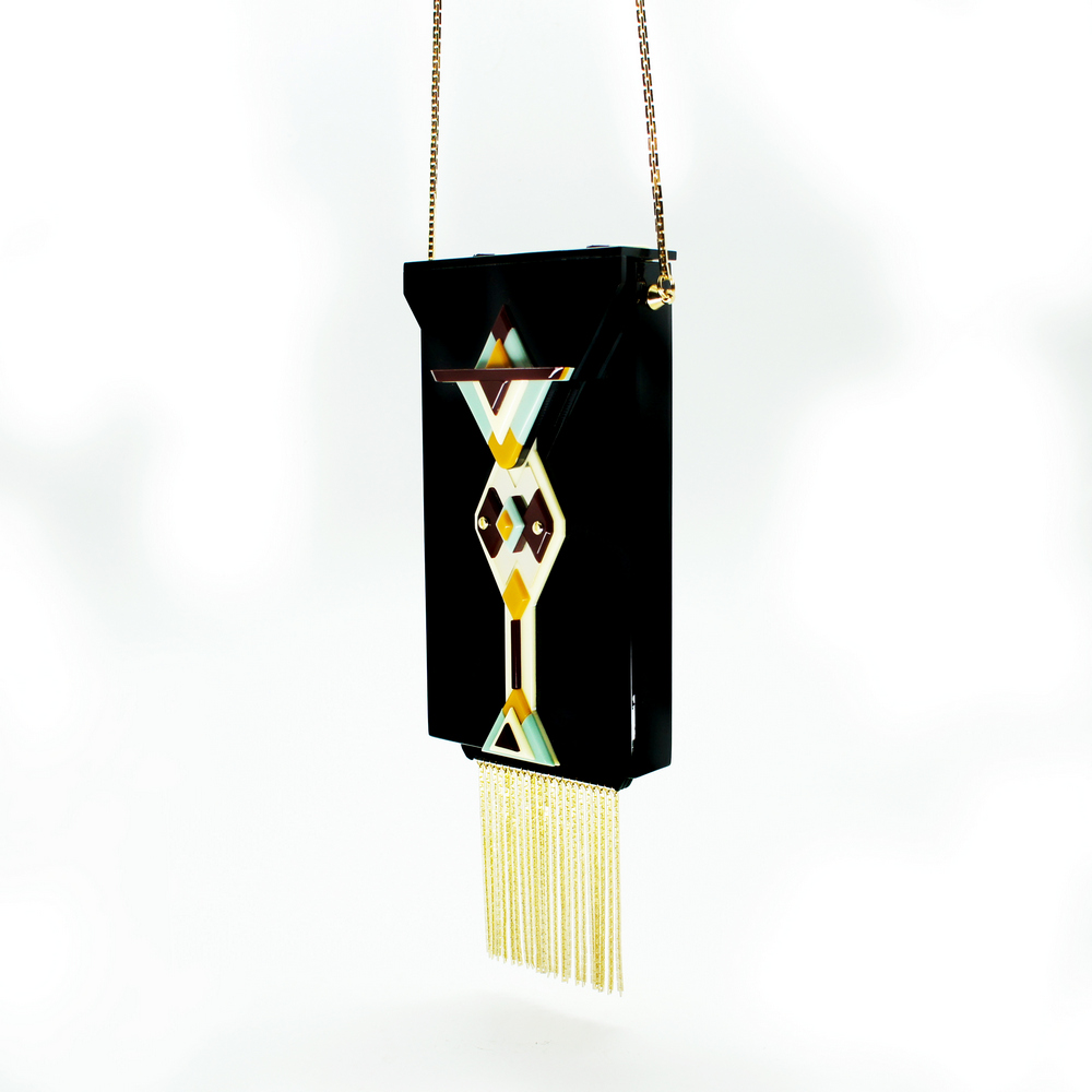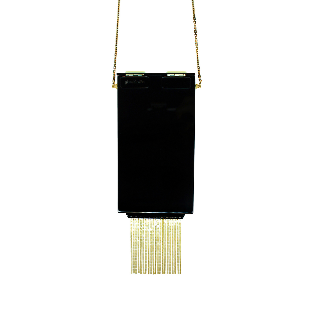 Clutch de acrílico, com fechamento de imã, com aplicação de enfeite de metal dourado, com franja de corrente, alça de corrente, metais com acabamento dourado. Feita a mão por artesãos brasileiros.
