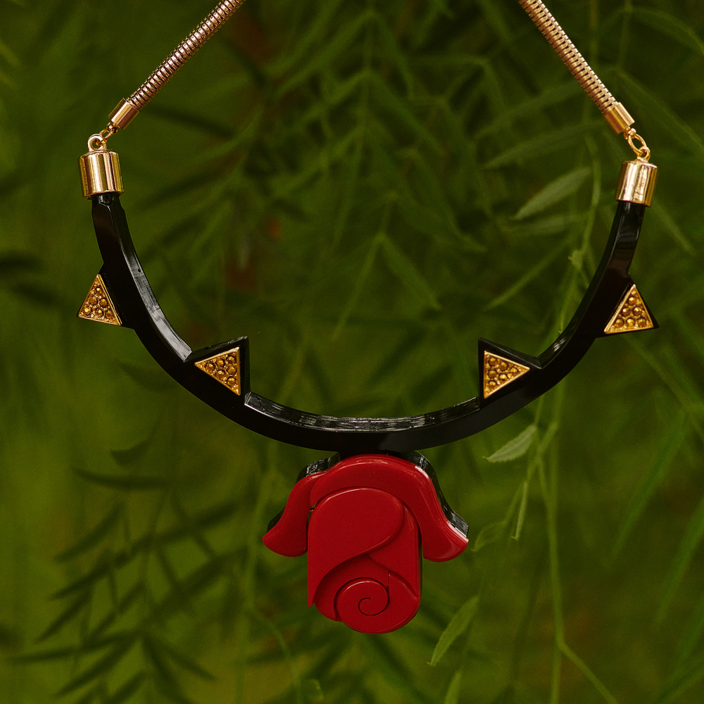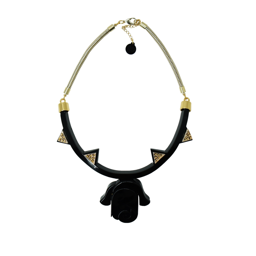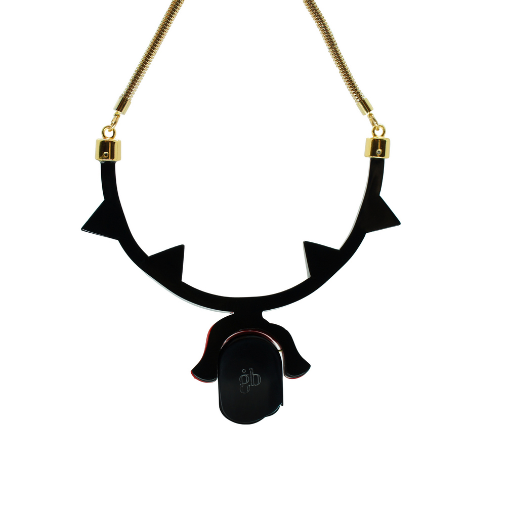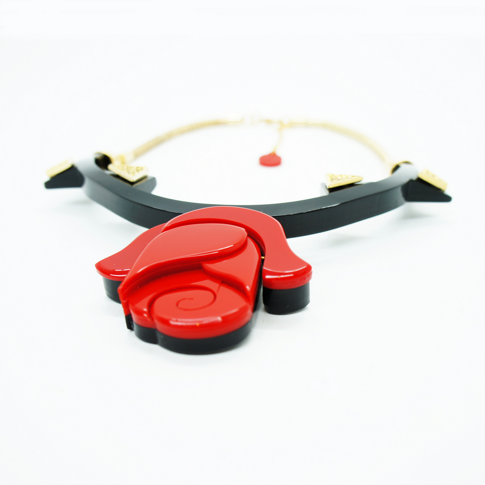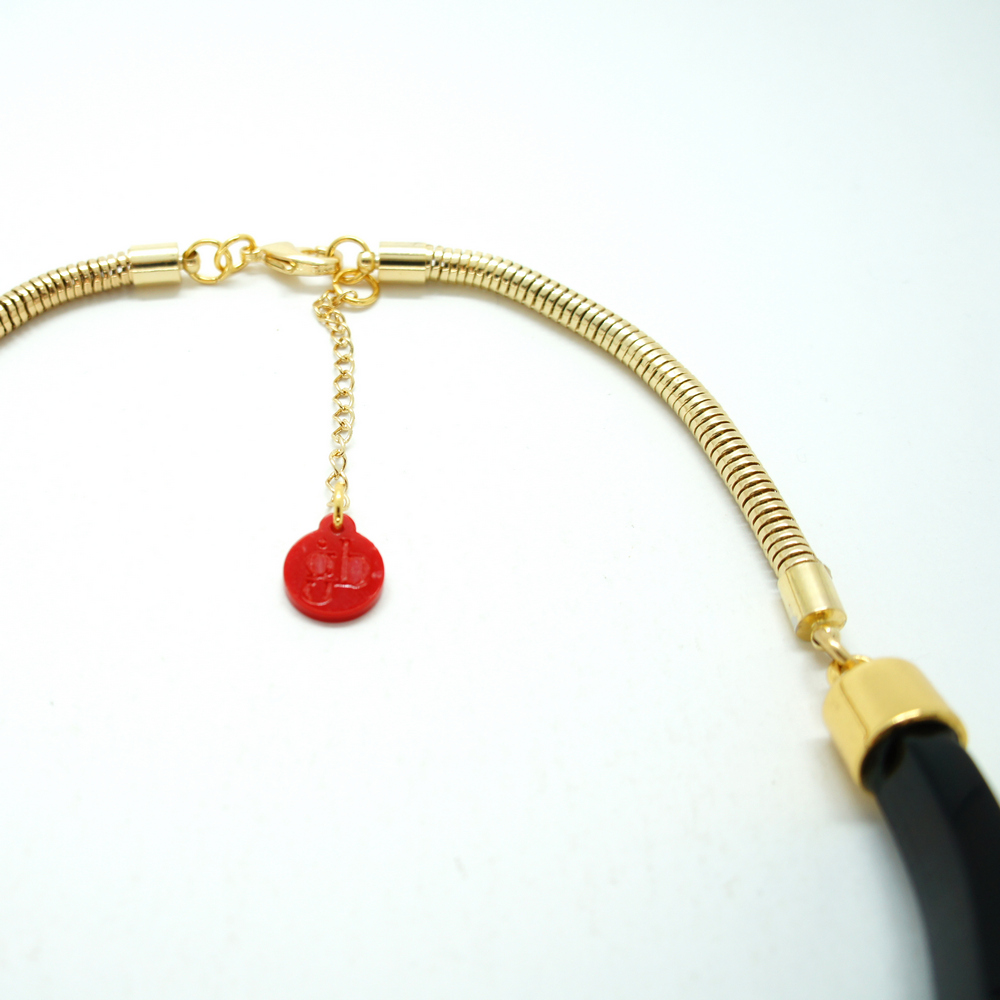 Colar de acrílico, modelo chocker, com aplicação de enfeites de metal e corrente de metal, fechamento por fecho lagosta. Metais com acabamento dourado. Feito à mão por artesãos brasileiros.