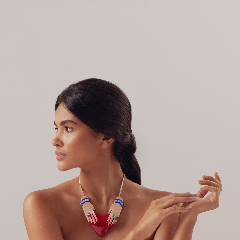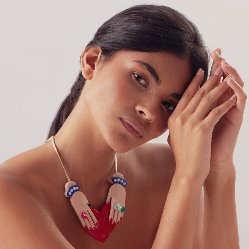 Colar de acrílico, feito à mão, com aplicação de strass de vidro, pérola sintética, corrente e metais com acabamento dourado.