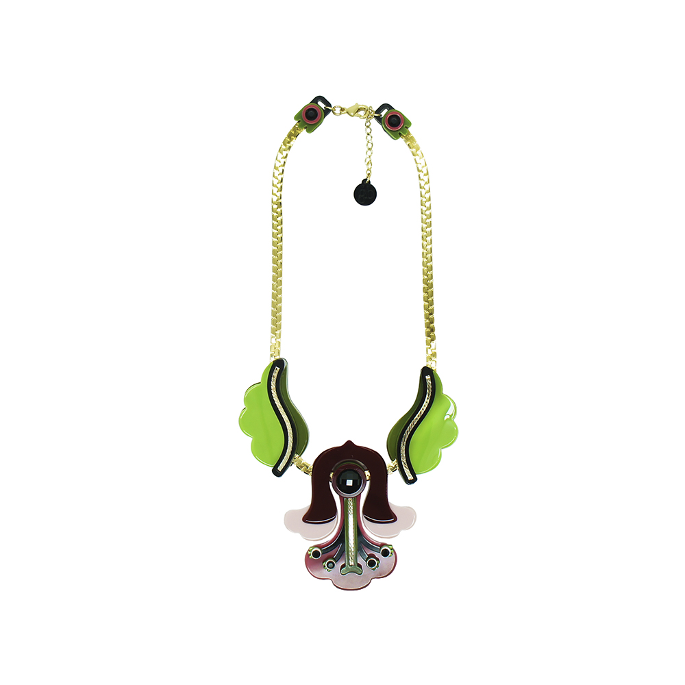 Colar artesanal em acrílico, articulado, com pedra de vidro, strass, metais com acabamento dourado.