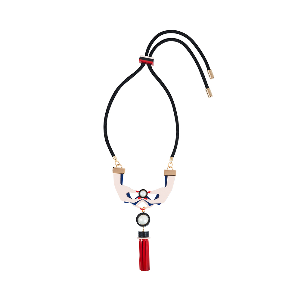 Colar de acrílico, feito à mão, modelo longo com pendente, cordão de algodão, com concha de pérola e metais com acabamento dourado.