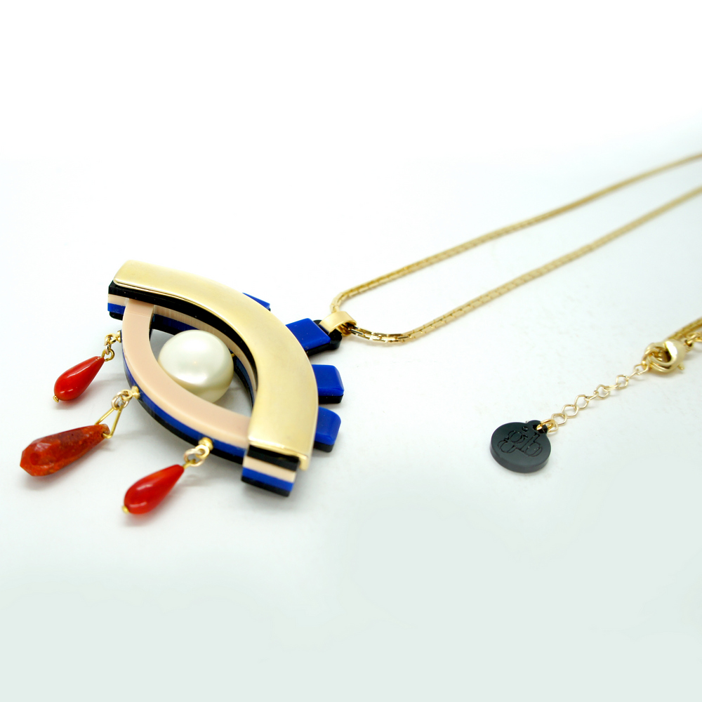 Colar de acrílico, feito à mão, com concha de pérola, com gotas de coral, corrente e metais com acabamento dourado.