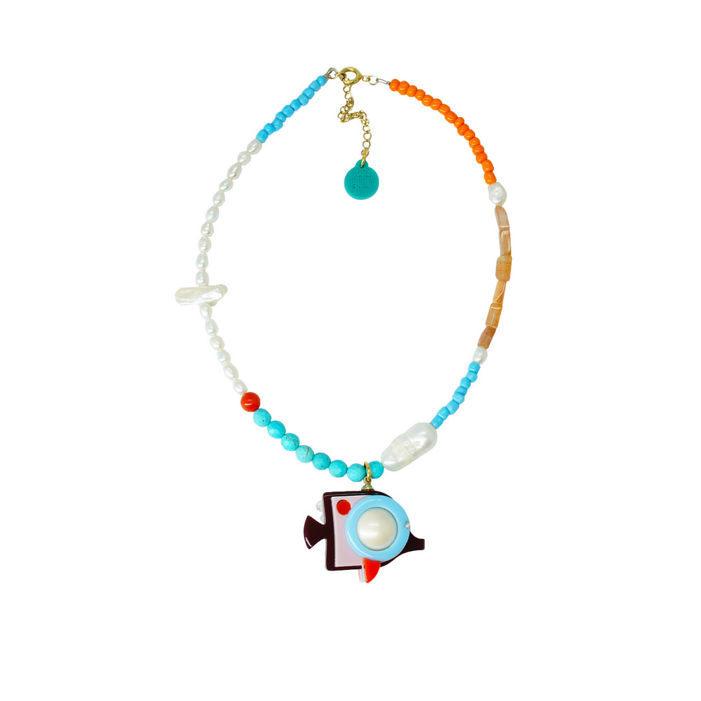 Colar feito de acrílico, modelo curto, com pérola shell e aplicação de strass de vidro no pigente de peixe, com miçangas de vidro, contas de pedra natural, pérola de água doce (pérola barroca) e metais com acabamento dourado. Feito a mão por artesãos brasileiros.