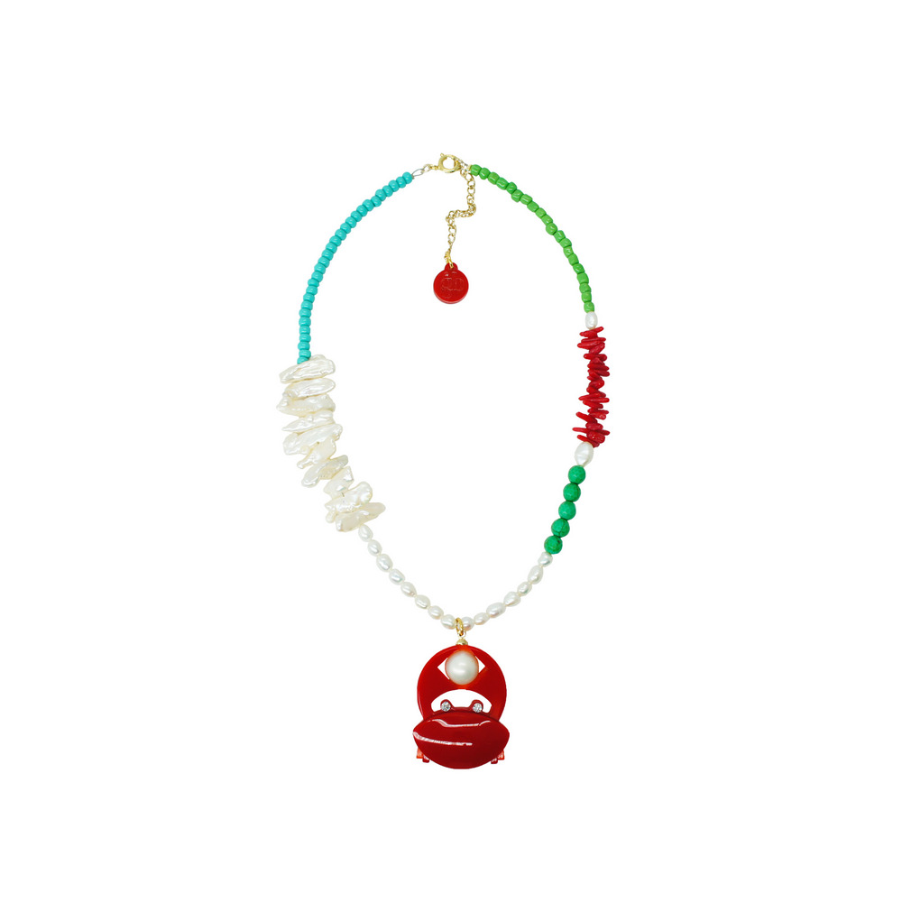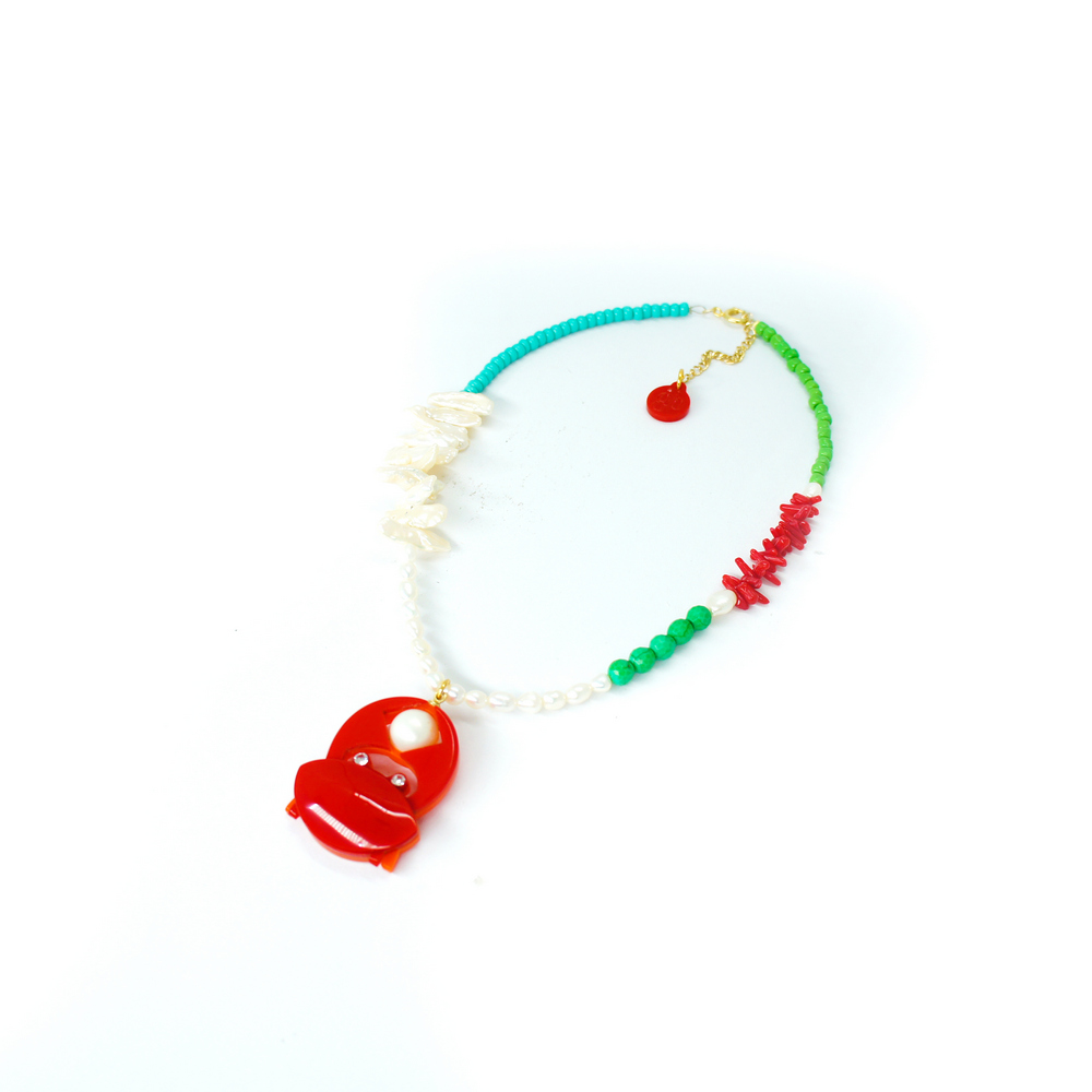 Colar feito de acrílico, modelo curto, com aplicação de strass de vidro, com pérola shell, com miçangas de vidro, com contas de pedra natural, pérola de água doce (pérola barroca) e metais com acabamento dourado. Feito a mão por artesãos brasileiros.