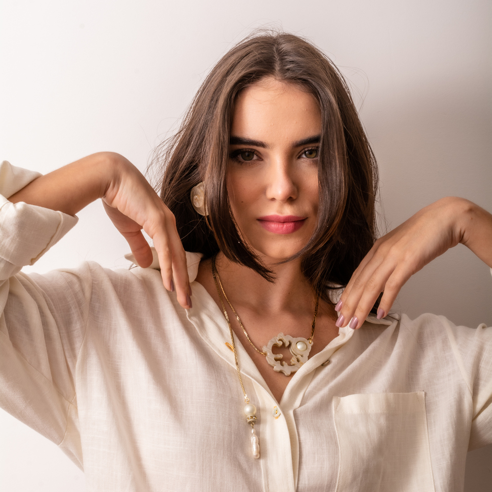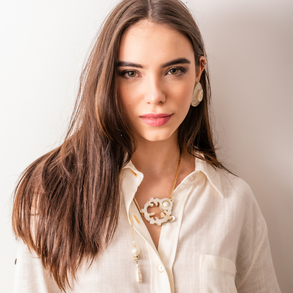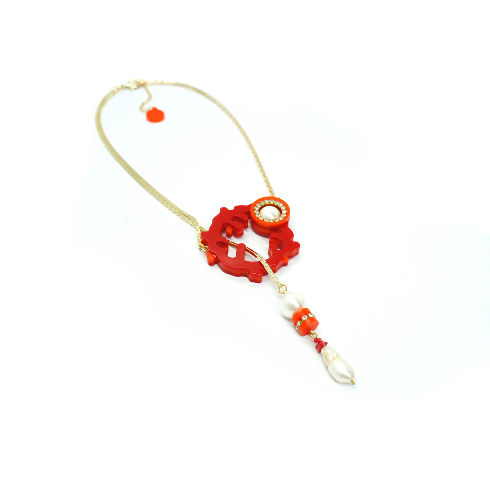 Colar feito de acrílico, modelo longo, com aplicação de strass de vidro, pérola cabochão e pérola de água de doce. Correntes e metais com acabamento dourado. Feito a mão por artesãos brasileiros.