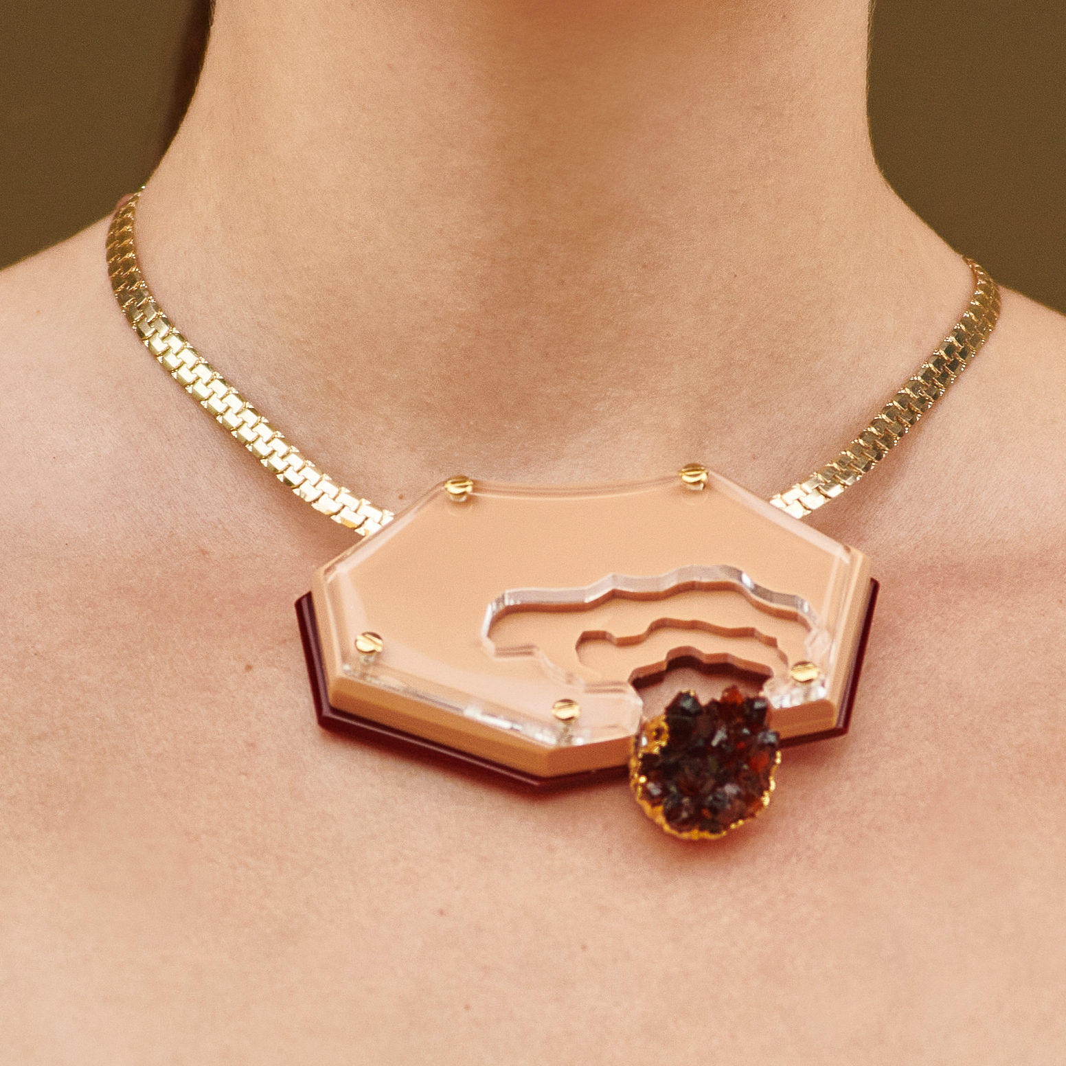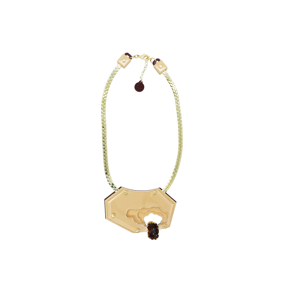 Colar de acrílico, feito à mão, com pendente em pedra natural Citrino, corrente e metais com acabamento dourado.