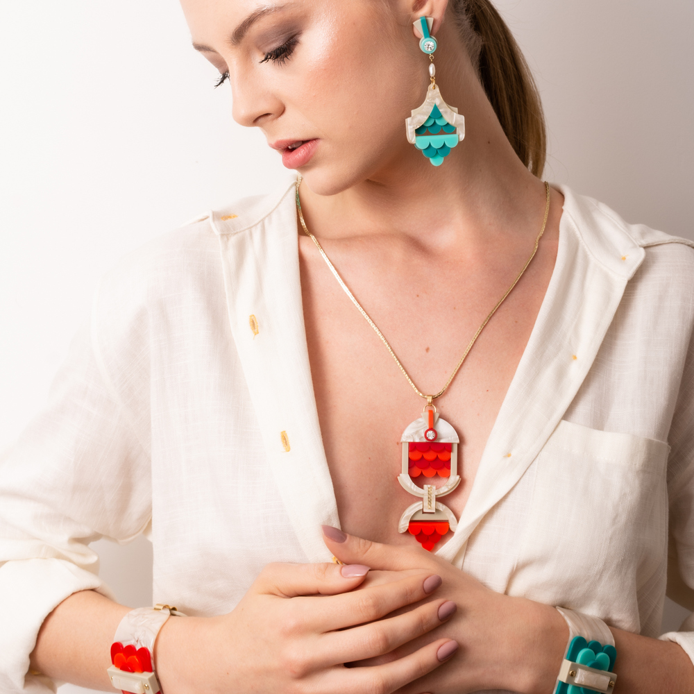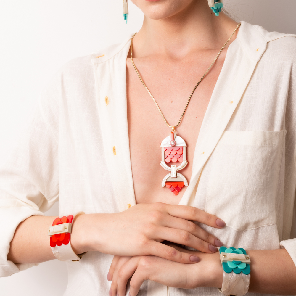 Colar feito de acrílico, modelo articulado, com aplicação de strass de vidro e corrente, correntes e metais com acabamento dourado. Feito a mão por artesãos brasileiros.