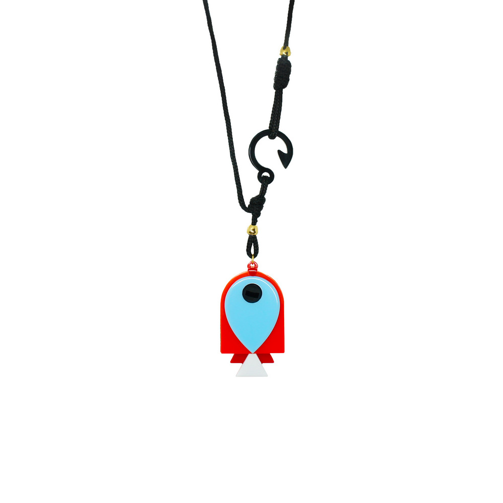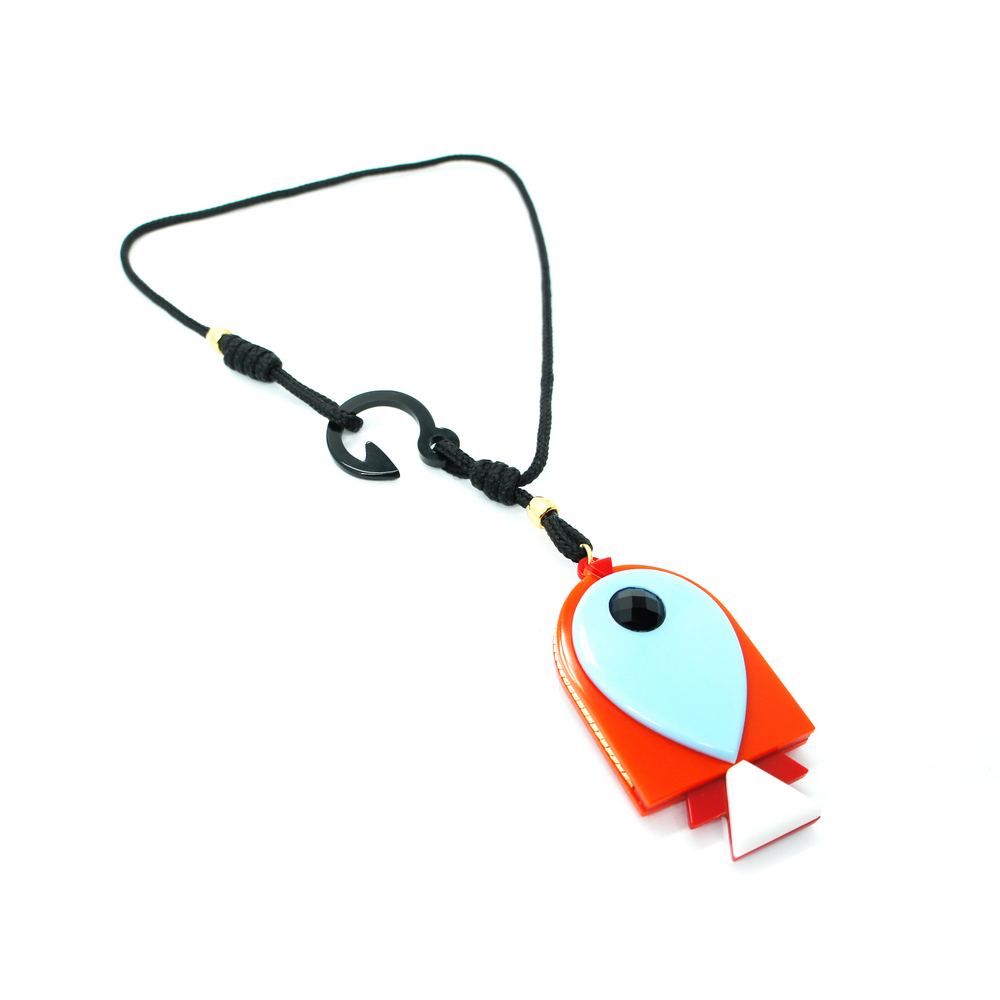 Colar feito de acrílico, com cordão sintético, com pedra de vidro, metais com acabamento dourado. Feito a mão por artesãos brasileiros.