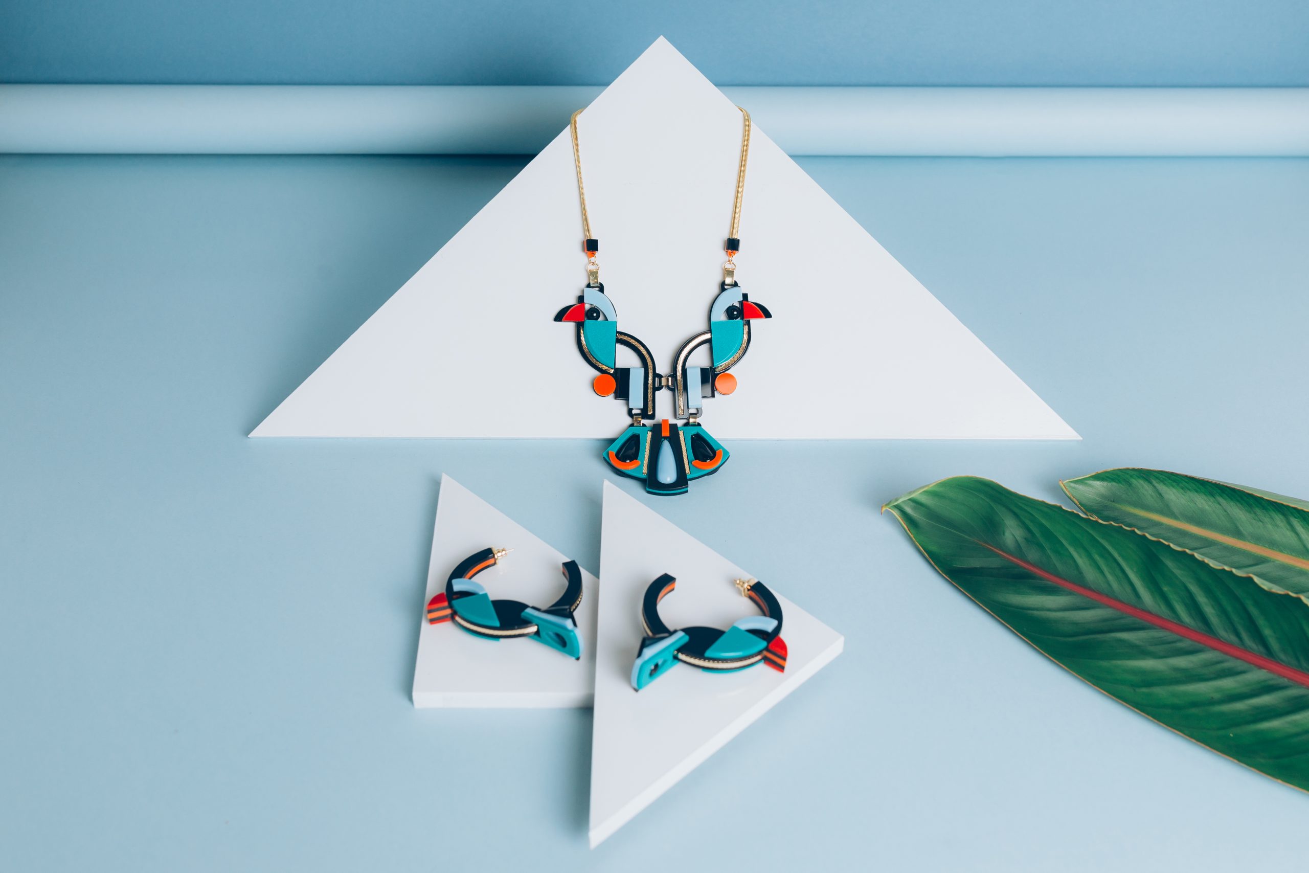 Colar Aves, feito de acrílico, modelo articulado, com aplicação de corrente, contas e gotas sintéticas, corrente de metal, metais com acabamento dourado. Feito à mão por artesãos brasileiros.