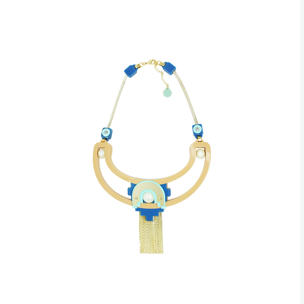 Colar curto de acrílico com aplicação de metal e franja de correntes, pérola sheel e strass de vidro. Fechamento com regulador e fecho lagosta. Metais com acabamento dourado. Feito a mão por artesãos brasileiros.