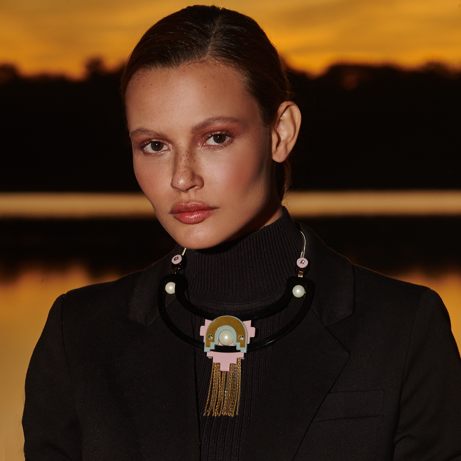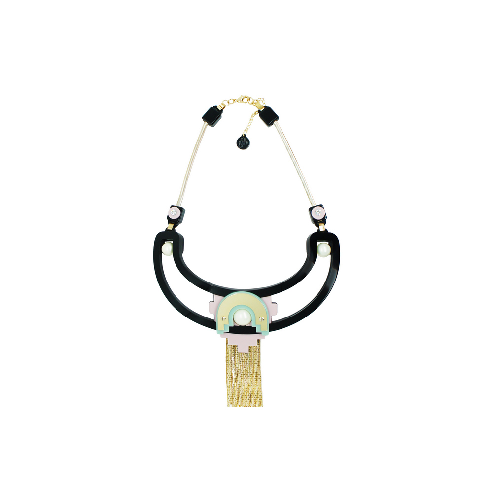 Colar curto de acrílico com aplicação de metal e franja de correntes, pérola sheel e strass de vidro. Fechamento com regulador e fecho lagosta. Metais com acabamento dourado. Feito a mão por artesãos brasileiros.