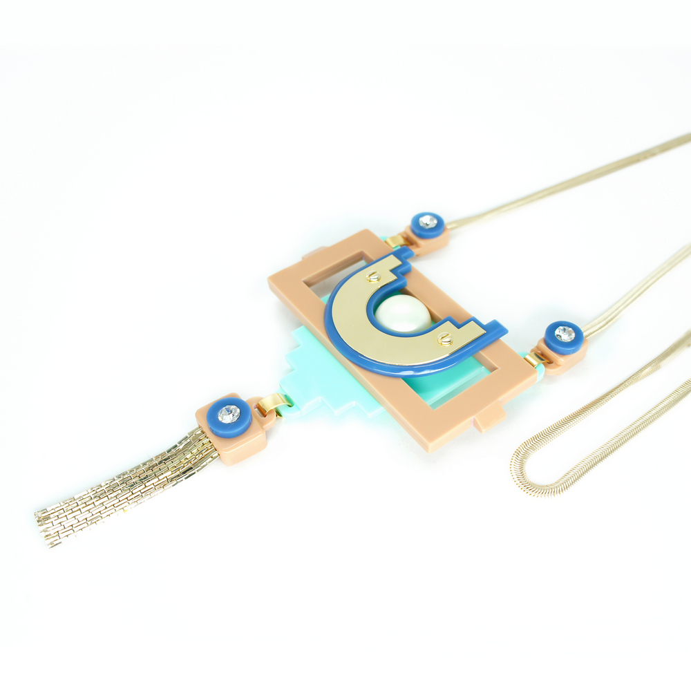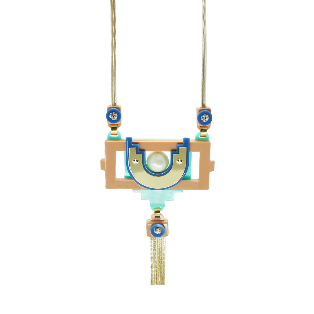 Colar longo com pendente em acrílico, com aplicação de metal e franja de correntes, pérola sheel e strass de vidro. Metais com acabamento dourado. Feito a mão por artesãos brasileiros.