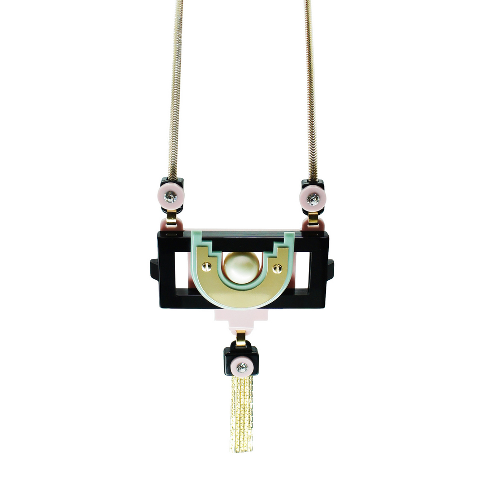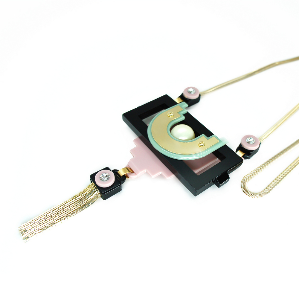 Colar longo com pendente em acrílico, com aplicação de metal e franja de correntes, pérola sheel e strass de vidro. Metais com acabamento dourado. Feito a mão por artesãos brasileiros.