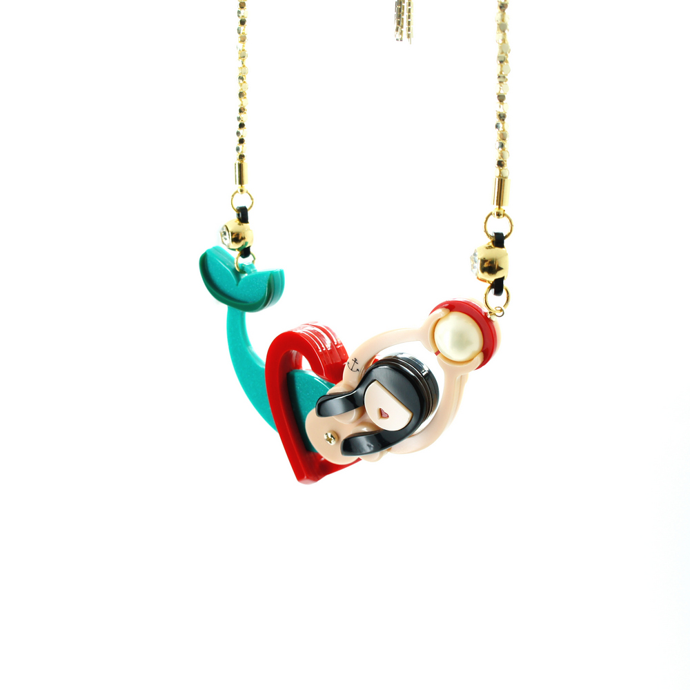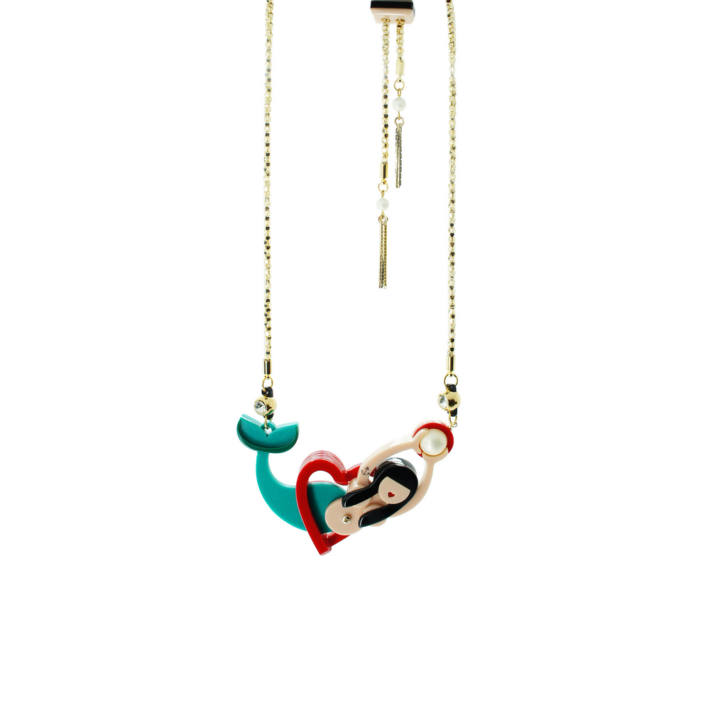 Colar de acrílico, modelo articulado, com pérola shell, strass de vidro e corrente. Metais com acabamento dourado. Feito à mão por artesãos brasileiros.
