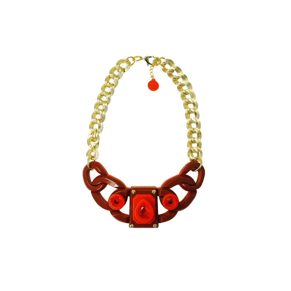 Colar feito de acrílico, modelo plastron, articulado, com pedra de vidro e correntes com acabamento dourado. Feito à mão por artesãos brasileiros.