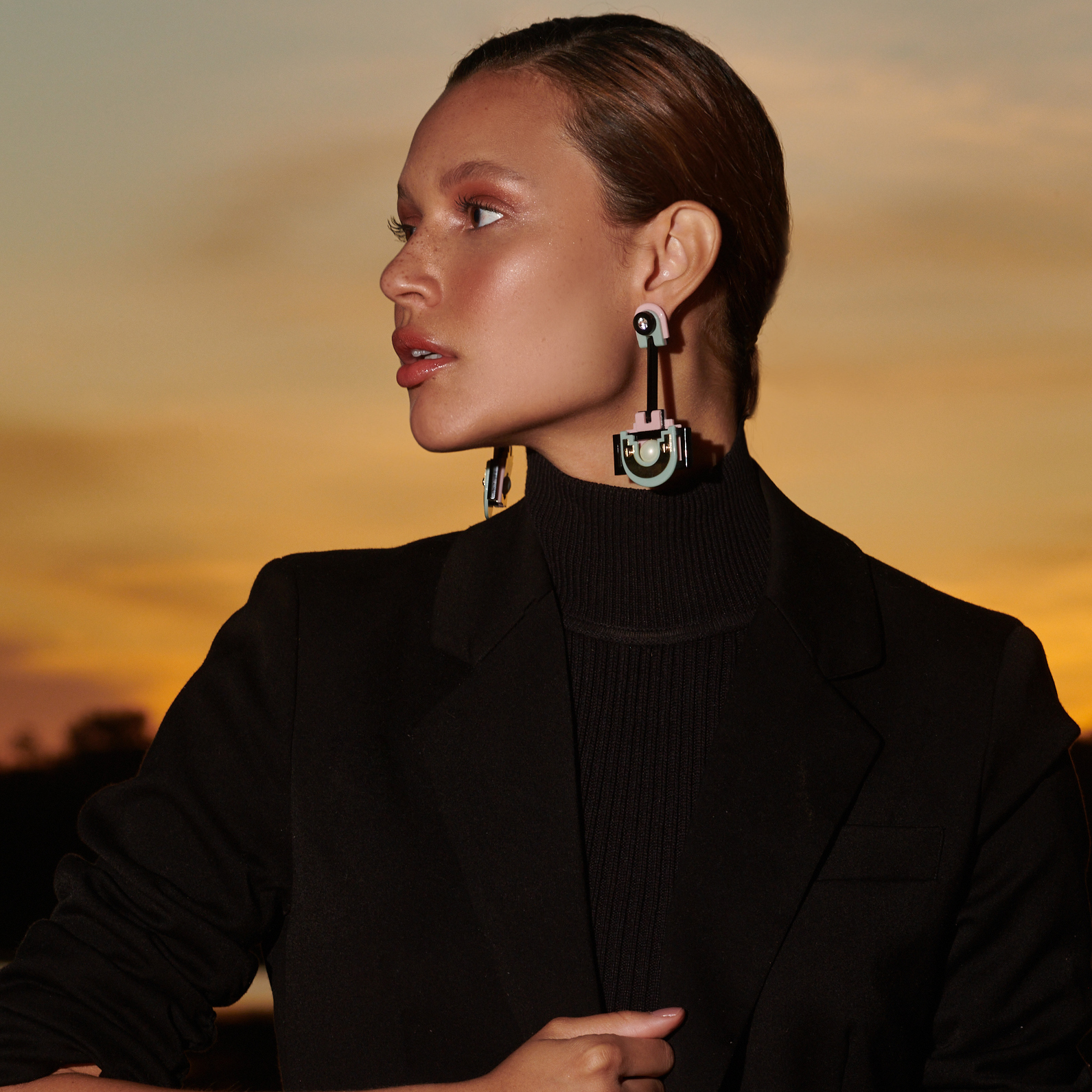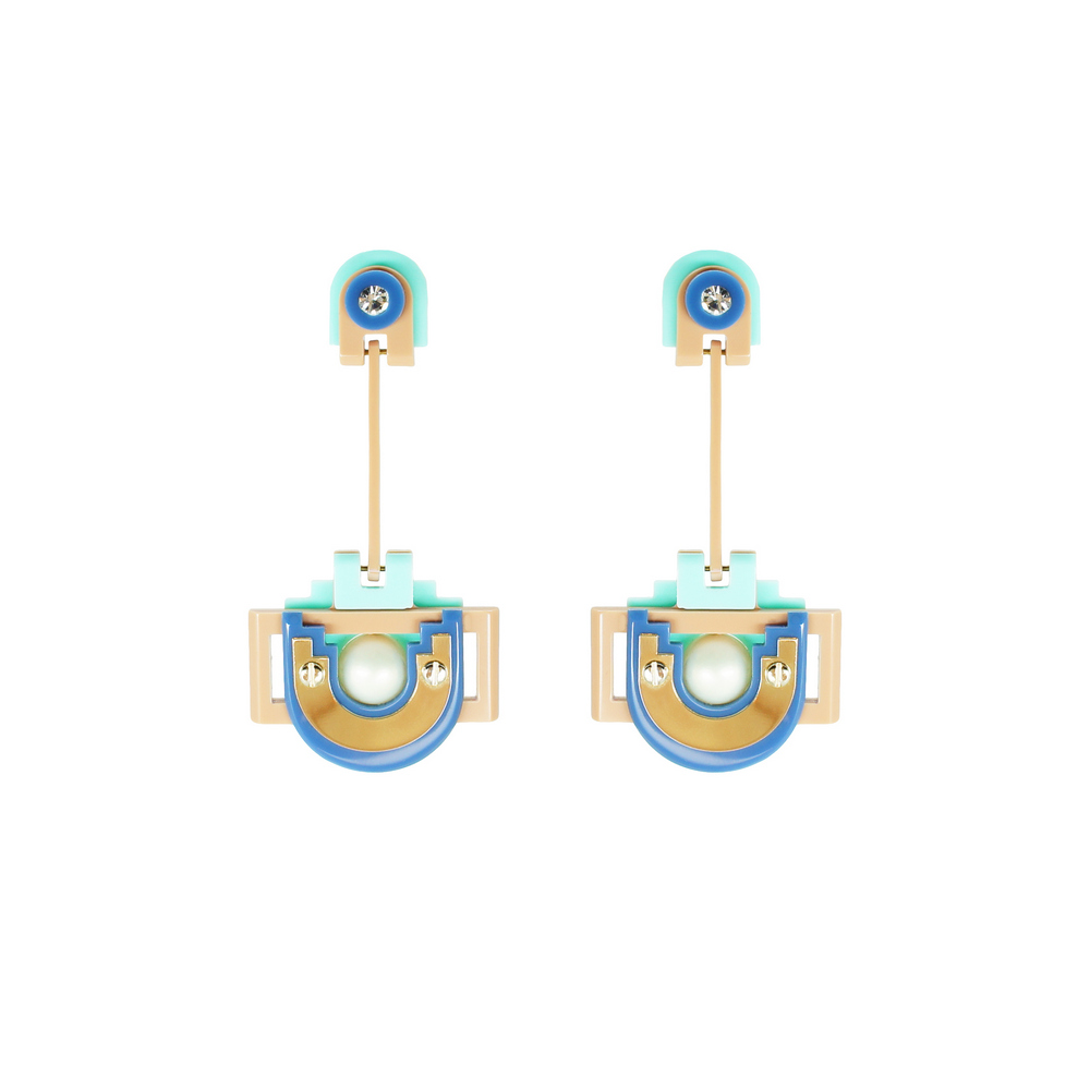 Brinco pendente de acrílico, com aplicação de enfeite de metal com acabamento ouro, pérola sheel, strass de vidro. Metais com acabamento dourado. Feito a mão por artesãos brasileiros.