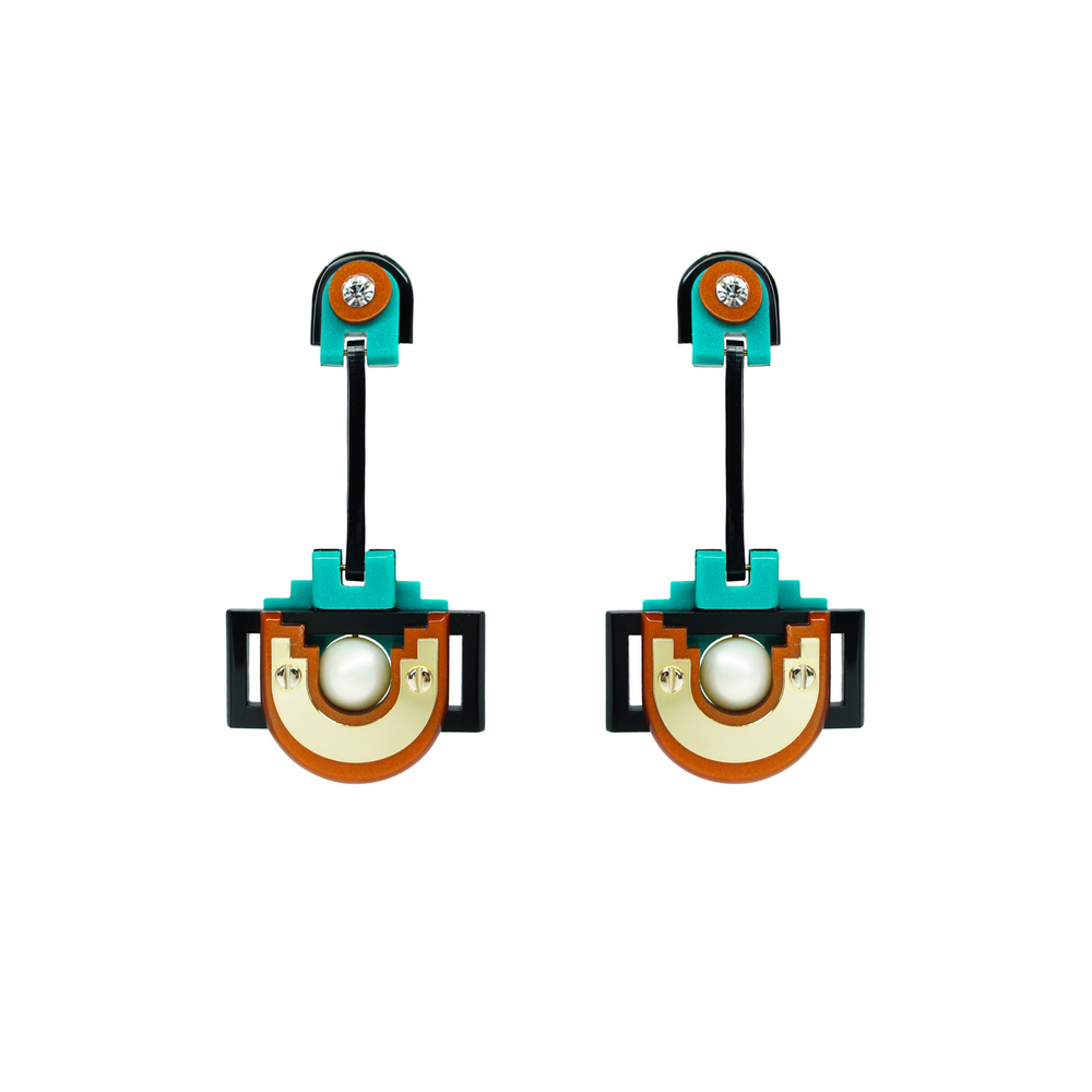 Brinco pendente de acrílico, com aplicação de enfeite de metal com acabamento ouro, pérola sheel, strass de vidro. Metais com acabamento dourado. Feito a mão por artesãos brasileiros.