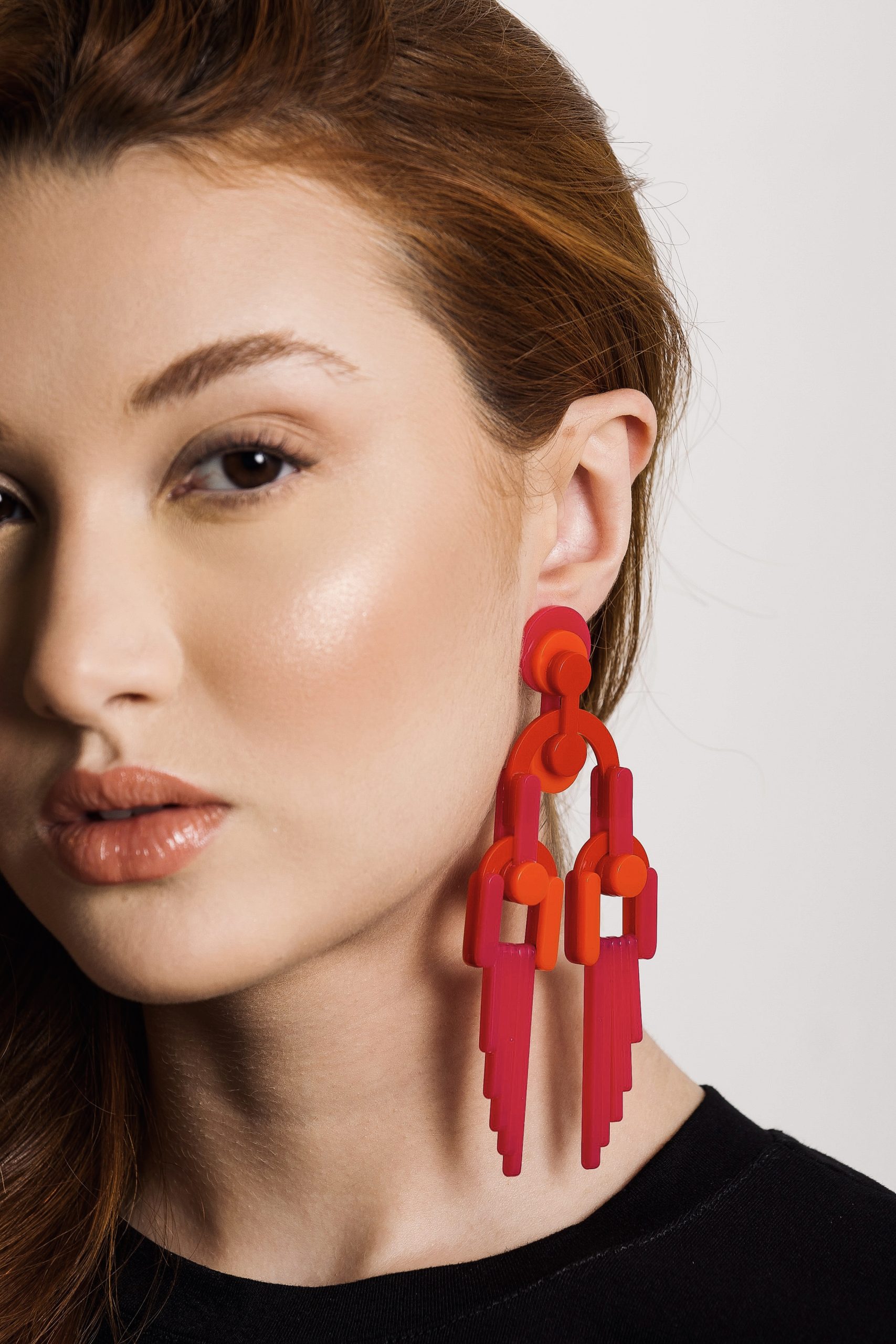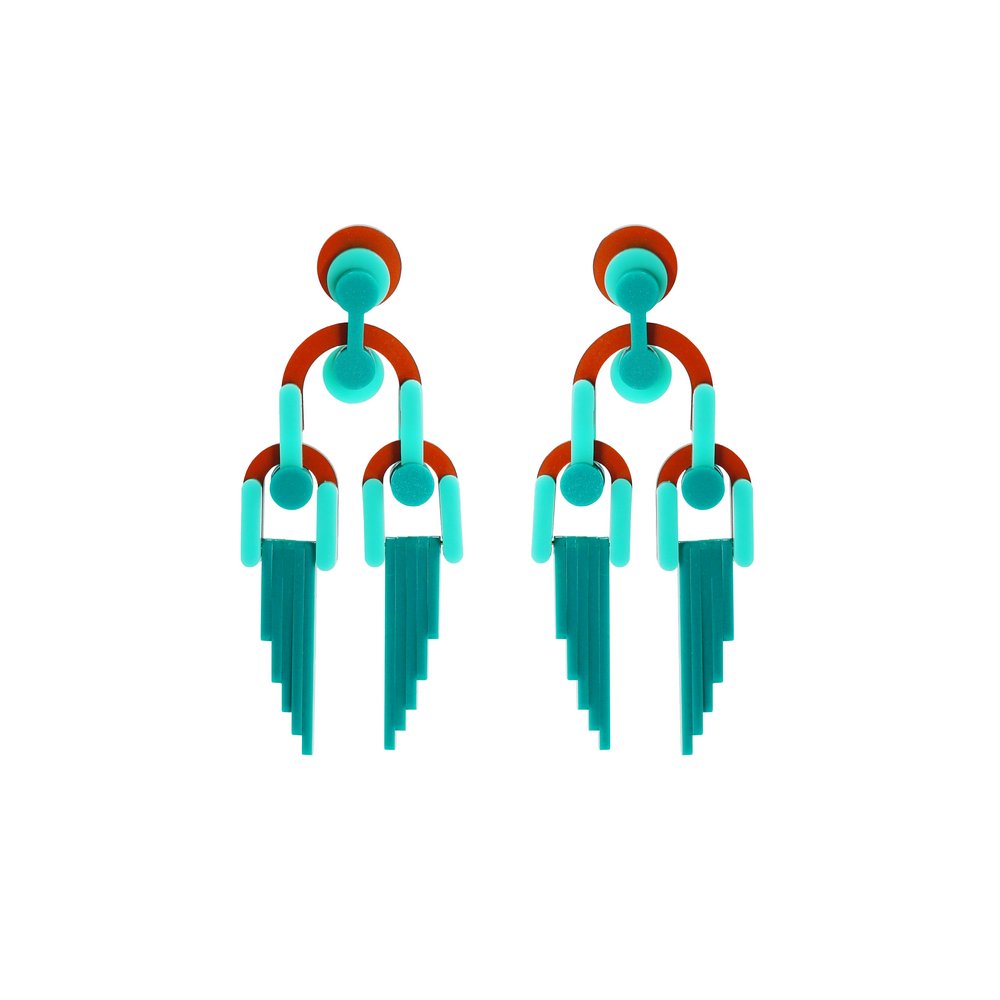 Brinco feito de acrílico, modelo articulado e pendente, metais com acabamento dourado. Feito a mão por artesãos brasileiros.