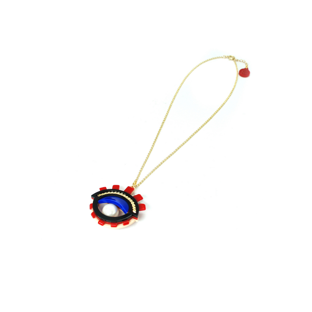 Colar feito de acrílico, modelo pingente, com aplicação de corrente e pérola shell, corrente e metais com acabamento dourado. Feito a mão por artesãos brasileiros.