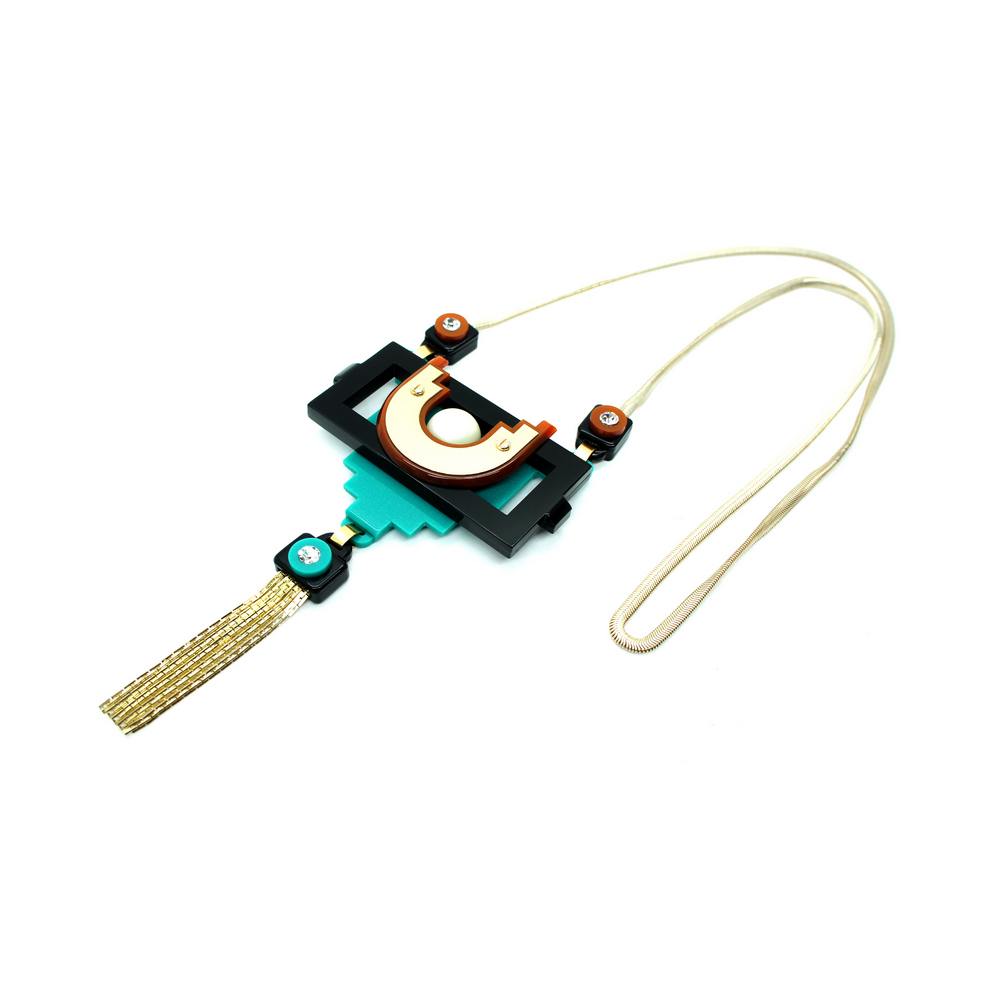 Colar longo com pendente em acrílico, com aplicação de metal e franja de correntes, pérola sheel e strass de vidro. Metais com acabamento dourado. Feito a mão por artesãos brasileiros.